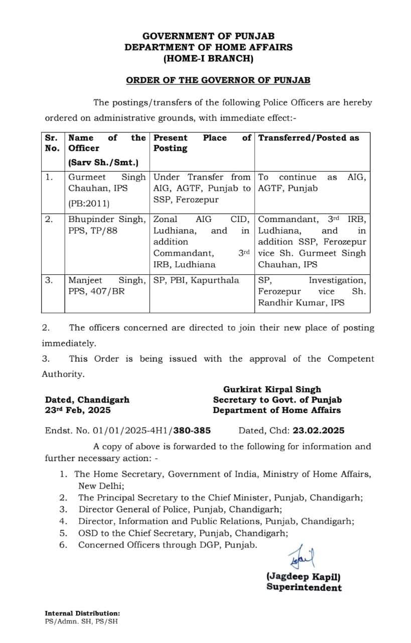 ਵੱਡੀ ਖ਼ਬਰ: ਪੰਜਾਬ ਸਰਕਾਰ ਵੱਲੋਂ 3 IPS ਅਤੇ PPS ਅਫ਼ਸਰਾਂ ਦਾ ਤਬਾਦਲਾ, ਪੜ੍ਹੋ ਲਿਸਟ All Latest NewsNews FlashPunjab News February 23, 2025 Media PBN Staff ਪੰਜਾਬ ਨੈੱਟਵਰਕ, ਚੰਡੀਗੜ੍ਹ ਪੰਜਾਬ ਸਰਕਾਰ ਦੇ ਵੱਲੋਂ ਤਿੰਨ ਆਈਪੀਐਸ ਅਤੇ ਪੀਪੀਐਸ ਅਫ਼ਸਰਾਂ ਦਾ ਤਬਾਦਲਾ ਕੀਤਾ ਗਿਆ ਹੈ। ਹੇਠਾਂ ਪੜ੍ਹੋ ਲਿਸਟ