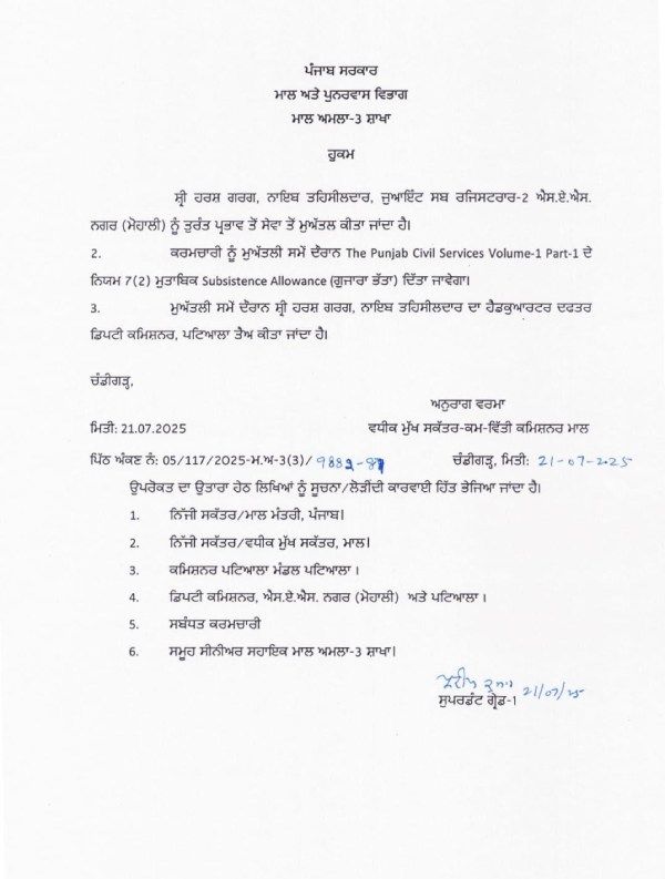 Big Breaking: ਪੰਜਾਬ ਸਰਕਾਰ ਵੱਲੋਂ ਨਾਇਬ ਤਹਿਸੀਲਦਾਰ ਸਸਪੈਂਡ, ਪੜ੍ਹੋ ਵੇਰਵਾ All Latest NewsNews FlashPunjab News July 21, 2025 Media PBN Staff Big Breaking: ਪੰਜਾਬ ਸਰਕਾਰ ਦੇ ਵੱਲੋਂ ਨਾਇਬ ਤਹਿਸੀਲਦਾਰ ਹਰਸ਼ ਗਰਗ ਨੂੰ ਸਸਪੈਂਡ ਕਰ ਦਿੱਤਾ ਗਿਆ ਹੈ। ਹੇਠਾਂ ਪੜ੍ਹੋ ਹੁਕਮਾਂ ਦੀ ਕਾਪੀ