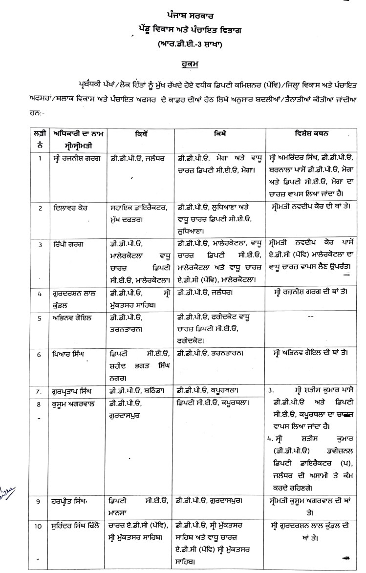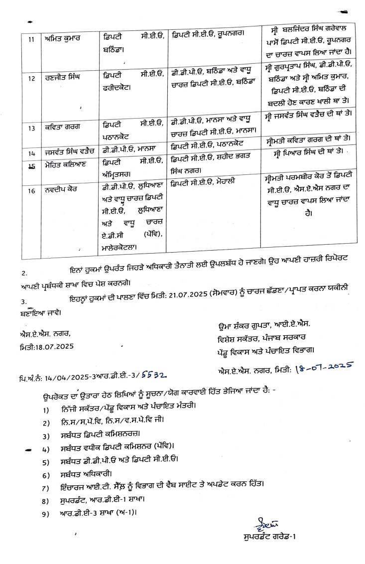 Punjab News: ਪੰਜਾਬ ਸਰਕਾਰ ਵੱਲੋਂ 8 DDPO ਸਮੇਤ 16 ਅਫ਼ਸਰਾਂ ਦਾ ਤਬਾਦਲਾ, ਪੜ੍ਹੋ ਲਿਸਟ All Latest NewsNews FlashPunjab News July 21, 2025 Media PBN Staff Punjab News: ਪੰਜਾਬ ਸਰਕਾਰ ਦੇ ਵੱਲੋਂ ਪੇਂਡੂ ਵਿਕਾਸ ਅਤੇ ਪੰਚਾਇਤ ਵਿਭਾਗ ਦੇ 8 ਡੀਡੀਈਓ ਸਮੇਤ 16 ਅਫ਼ਸਰਾਂ ਦਾ ਤਬਾਦਲਾ ਕੀਤਾ ਗਿਆ ਹੈ। ਹੇਠਾਂ ਪੜ੍ਹੋ ਲਿਸਟ