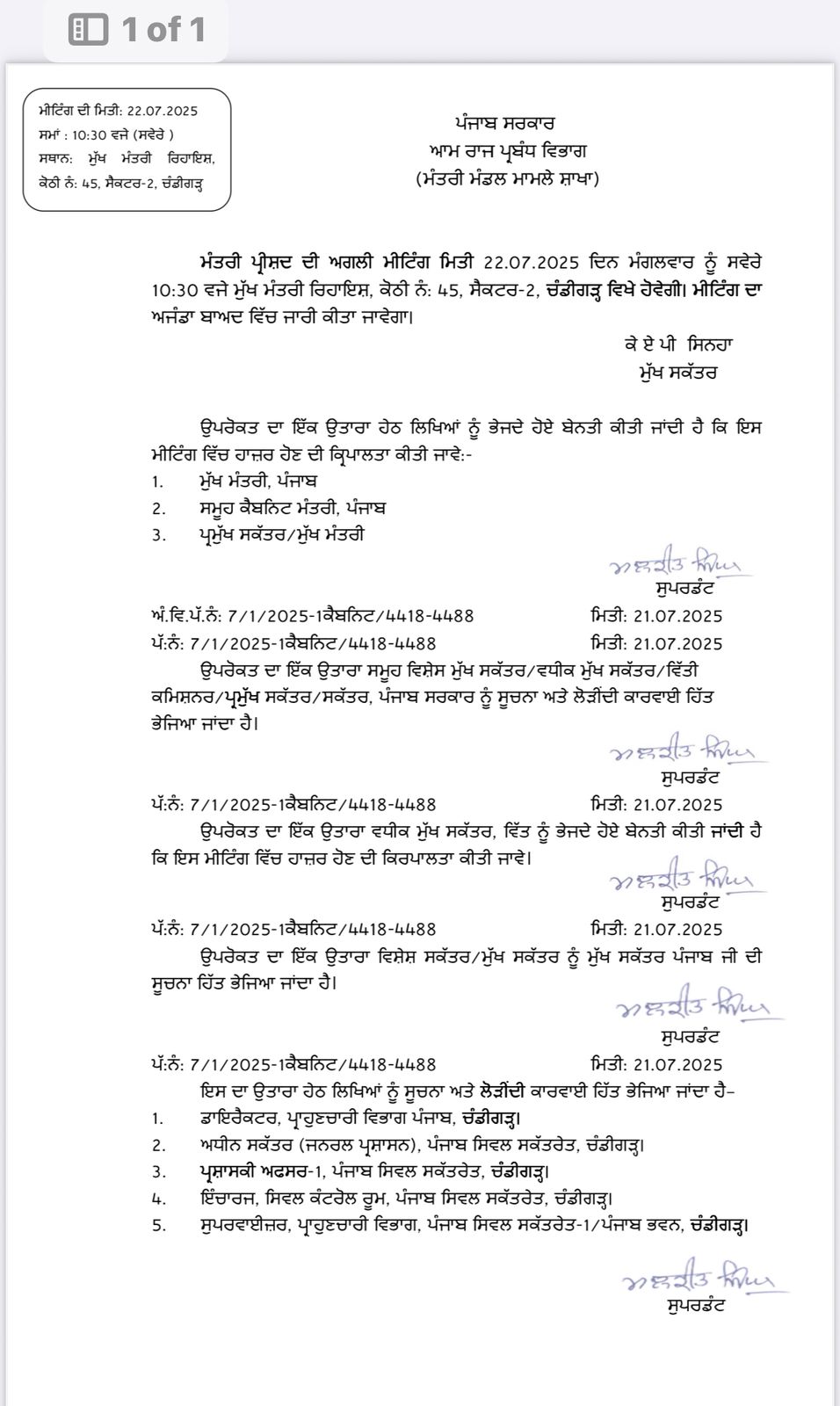 ਜਿਸ ਵਿੱਚ ਦੱਸਿਆ ਗਿਆ ਹੈ ਕਿ ਸੀਐੱਮ ਮਾਨ ਦੀ ਚੰਡੀਗੜ੍ਹ ਸਥਿਤ ਸਰਕਾਰੀ ਰਿਹਾਇਸ਼ ਤੇ ਇਹ ਮੀਟਿੰਗ ਹੋਵੇਗੀ।