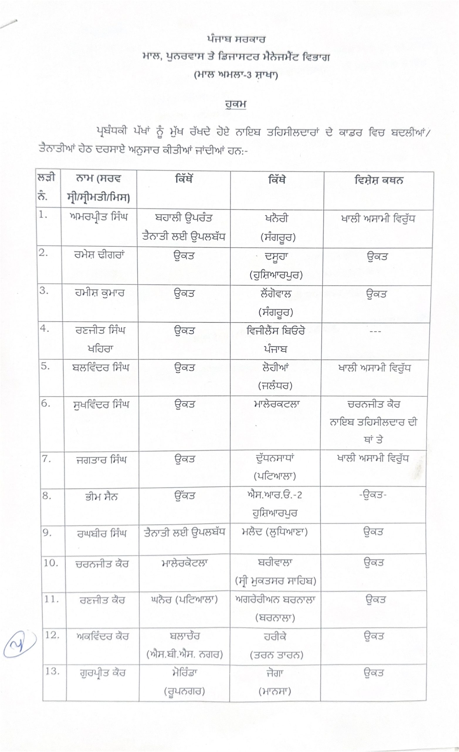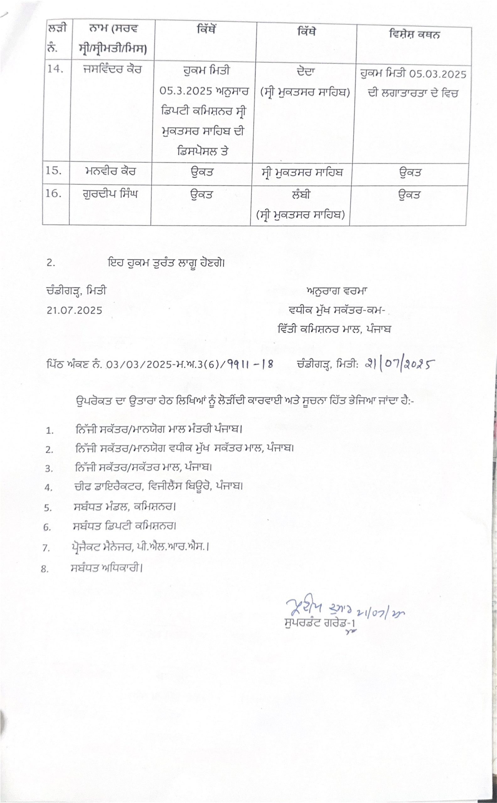 ਪੰਜਾਬ ਸਰਕਾਰ ਵੱਲੋਂ 16 ਨਾਇਬ ਤਹਿਸੀਲਦਾਰਾਂ ਦਾ ਤਬਾਦਲਾ, ਪੜ੍ਹੋ ਲਿਸਟ All Latest NewsNews FlashPunjab News July 22, 2025 Media PBN Staff Punjab News: ਪੰਜਾਬ ਸਰਕਾਰ ਦੇ ਵੱਲੋਂ 16 ਨਾਇਬ ਤਹਿਸੀਲਦਾਰਾਂ ਦੀਆਂ ਬਦਲੀਆਂ ਕੀਤੀਆਂ ਗਈਆਂ ਹਨ। ਹੇਠਾਂ ਪੜ੍ਹੋ ਲਿਸਟ