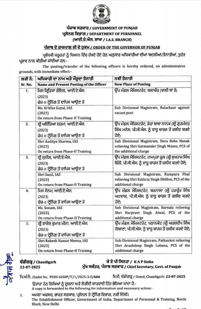 ਵੱਡੀ ਖ਼ਬਰ: ਪੰਜਾਬ ਸਰਕਾਰ ਵੱਲੋਂ ਪੰਜ IAS ਅਫ਼ਸਰਾਂ ਦਾ ਤਬਾਦਲਾ, ਪੜ੍ਹੋ ਲਿਸਟ All Latest NewsNews FlashPunjab News July 24, 2025 Media PBN Staff Punjab News: ਪੰਜਾਬ ਸਰਕਾਰ ਦੇ ਵੱਲੋਂ ਪੰਜ IAS ਅਫ਼ਸਰਾਂ ਦਾ ਤਬਾਦਲਾ ਕੀਤਾ ਗਿਆ ਹੈ। ਹੇਠਾਂ ਪੜ੍ਹੋ ਲਿਸਟ –