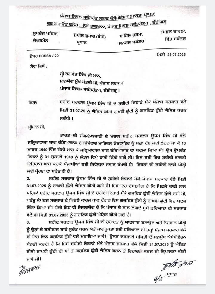 ਪੰਜਾਬ ਸਰਕਾਰ 31 ਜੁਲਾਈ ਦੀ ਛੁੱਟੀ ਦਾ ਐਲਾਨ ਕਰੇ! All Latest NewsNews FlashPunjab News July 25, 2025 Media PBN Staff Punjab News: ਪੰਜਾਬ ਸਰਕਾਰ 31 ਜੁਲਾਈ ਦੀ ਛੁੱਟੀ ਦਾ ਐਲਾਨ ਕਰੇ। ਇਹ ਮੰਗ ਪੰਜਾਬ ਸਿਵਲ ਸਕੱਤਰੇਤ ਸਟਾਫ਼ ਐਸੋਸੀਏਸ਼ਨ ਦੇ ਵੱਲੋਂ ਕੀਤੀ ਗਈ ਹੈ।
