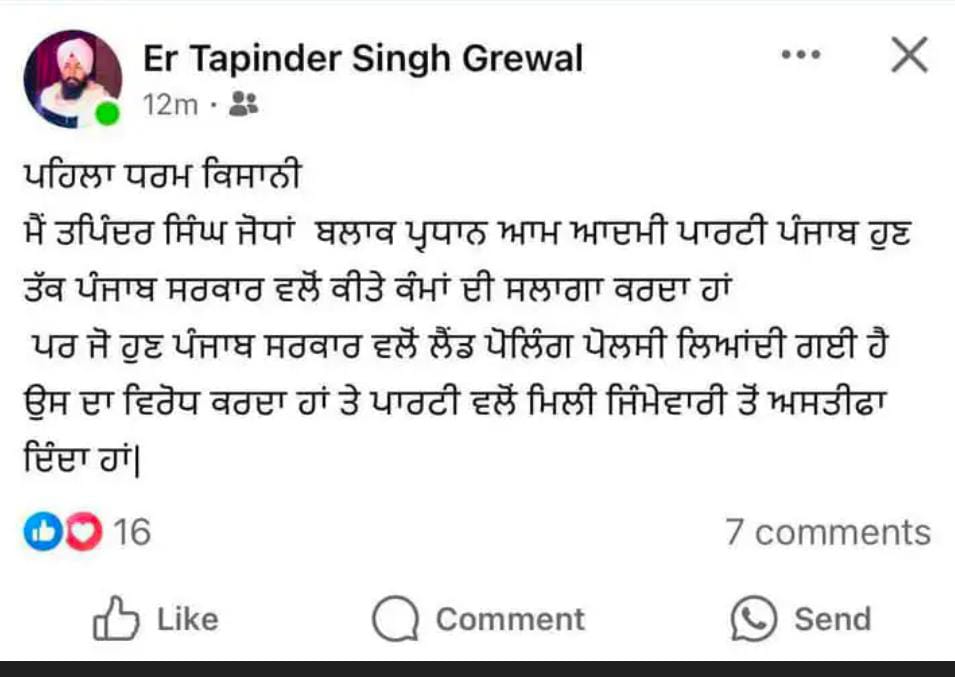 ਉਨ੍ਹਾਂ ਨੇ ਆਪਣੀ ਪੋਸਟ ਵਿੱਚ ਲਿਖਿਆ ਕਿ ਉਹ ਪਾਰਟੀ ਦੇ ਹੋਰ ਕੰਮਾਂ ਦੀ ਕਦਰ ਕਰਦੇ ਹਨ, ਪਰ ਕਿਸਾਨਾਂ ਨਾਲ ਸਬੰਧਤ ਇਸ ਲੈਂਡ ਪੂਲਿੰਗ ਨੀਤੀ ਦਾ ਸਮਰਥਨ ਨਹੀਂ ਕਰ ਸਕਦੇ, ਅਤੇ ਇਸ ਕਾਰਨ ਉਹ ਆਪਣਾ ਅਹੁਦਾ ਛੱਡ ਰਹੇ ਹਨ।