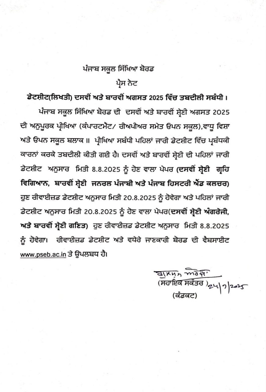 PSEB Exam: ਪੰਜਾਬ ਸਕੂਲ ਸਿੱਖਿਆ ਬੋਰਡ ਦੀ ਦਸਵੀਂ ਅਤੇ ਬਾਰਵੀਂ ਸ਼੍ਰੇਣੀ ਅਗਸਤ 2025 ਦੀ ਅਨੁਪੂਰਕ ਪ੍ਰੀਖਿਆ (ਕੰਪਾਰਟਮੈਂਟ/ ਰੀਅਪੀਅਰ ਸਮੇਤ ਓਪਨ ਸਕੂਲ), ਵਾਧੂ ਵਿਸ਼ਾ ਅਤੇ ਓਪਨ ਸਕੂਲ ਬਲਾਕ ॥ ਪ੍ਰੀਖਿਆ ਮਿਤੀ 8.8.2025 ਤੋਂ 20.8.2025 ਤੱਕ ਬੋਰਡ ਵੱਲੋਂ ਸਥਾਪਿਤ ਪ੍ਰੀਖਿਆ ਕੇਂਦਰਾਂ ਵਿੱਚ ਕਰਵਾਈ ਜਾਵੇਗੀ।
