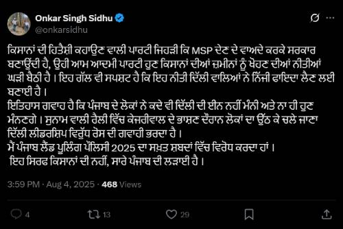ਓਂਕਾਰ ਸਿੰਘ ਨੇ ਟਵੀਟ ਕਰਦਿਆਂ ਹੋਇਆ ਲਿਖਿਆ ਕਿ, ਕਿਸਾਨਾਂ ਦੀ ਹਿਤੈਸ਼ੀ ਕਹਾਉਣ ਵਾਲੀ ਪਾਰਟੀ ਜਿਹੜੀ ਕਿ MSP ਦੇਣ ਦੇ ਵਾਅਦੇ ਕਰਕੇ ਸਰਕਾਰ ਬਣਾਉਂਦੀ ਹੈ, ਉਹੀ ਆਮ ਆਦਮੀ ਪਾਰਟੀ ਹੁਣ ਕਿਸਾਨਾਂ ਦੀਆਂ ਜ਼ਮੀਨਾਂ ਨੂੰ ਖੋਹਣ ਦੀਆਂ ਨੀਤੀਆਂ ਘੜੀ ਬੈਠੀ ਹੈ। ਇਹ ਗੱਲ ਵੀ ਸਪਸ਼ਟ ਹੈ ਕਿ ਇਹ ਨੀਤੀ ਦਿੱਲੀ ਵਾਲਿਆਂ ਨੇ ਨਿੱਜੀ ਫਾਇਦਾ ਲੈਣ ਲਈ ਬਣਾਈ ਹੈ।