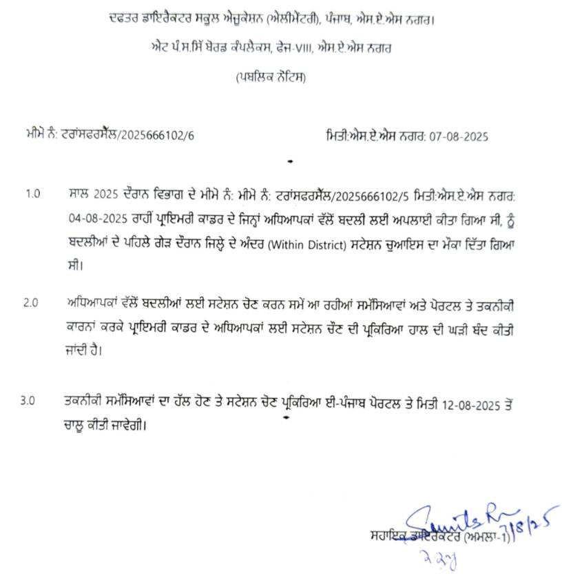 ਵਿਭਾਗ ਦੁਆਰਾ ਜਾਰੀ ਕੀਤੇ ਗਏ ਪੱਤਰ ਵਿੱਚ ਕਿਹਾ ਗਿਆ ਹੈ ਕਿ 4 ਅਗਸਤ 2025 ਰਾਹੀਂ ਪ੍ਰਾਇਮਰੀ ਕਾਡਰ ਦੇ ਜਿਨ੍ਹਾਂ ਅਧਿਆਪਕਾਂ ਵਲੋਂ ਬਦਲੀ ਲਈ ਅਪਲਾਈ ਕੀਤਾ ਗਿਆ ਸੀ, ਨੂੰ ਬਦਲੀਆਂ ਦੇ ਪਹਿਲੇ ਗੇੜ ਦੌਰਾਨ ਜਿਲ੍ਹੇ ਦੇ ਅੰਦਰ ਸਟੇਸ਼ਨ ਚੁਆਇਸ ਦਾ ਮੌਕਾ ਦਿੱਤਾ ਗਿਆ ਸੀ।