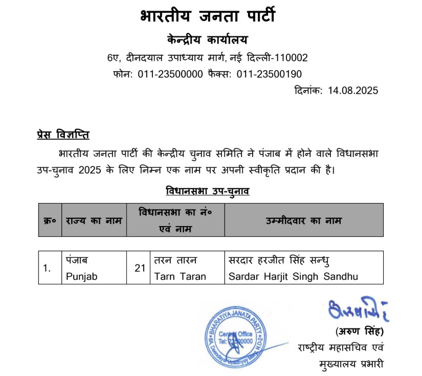 ਵੱਡੀ ਖ਼ਬਰ: ਭਾਜਪਾ ਨੇ ਤਰਨਤਾਰਨ ਤੋਂ ਉਮੀਦਵਾਰ ਐਲਾਨਿਆ, ਜਾਣੋ ਕੌਣ? All Latest NewsNews FlashPunjab News August 14, 2025 Media PBN Staff Punjab Breaking: ਭਾਰਤੀ ਜਨਤਾ ਪਾਰਟੀ (BJP) ਦੇ ਵੱਲੋਂ ਤਰਨਤਾਰਨ ਜਿਮਨੀ ਚੋਣ ਲਈ ਆਪਣੇ ਉਮੀਦਵਾਰ ਦਾ ਐਲਾਨ ਕਰ ਦਿੱਤਾ ਹੈ। ਭਾਜਪਾ ਦੇ ਵੱਲੋਂ ਸੀਨੀਅਰ ਭਾਜਪਾਈ ਲੀਡਰ ਹਰਜੀਤ ਸਿੰਘ ਸੰਧੂ ਨੂੰ ਆਪਣਾ ਉਮੀਦਵਾਰ ਬਣਾਇਆ ਗਿਆ ਹੈ।