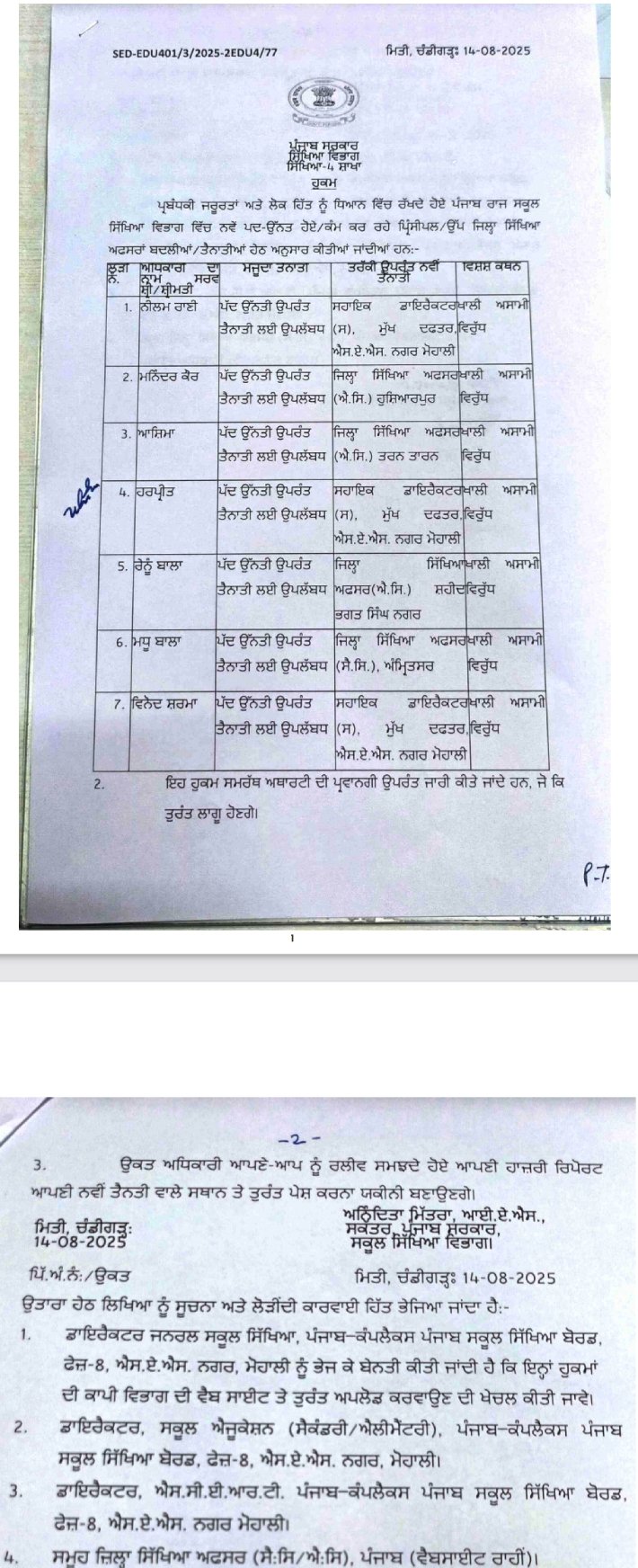 ਸਿੱਖਿਆ ਵਿਭਾਗ ਵੱਲੋਂ ਪ੍ਰਿੰਸੀਪਲਾਂ ਅਤੇ ਡਿਪਟੀ DEOs ਦੇ ਤਬਾਦਲੇ, ਪੜ੍ਹੋ ਲਿਸਟ All Latest NewsNews FlashPunjab News August 16, 2025 Media PBN Staff Education News ਪੰਜਾਬ ਸਕੂਲ ਸਿੱਖਿਆ ਵਿਭਾਗ ਵੱਲੋਂ ਸੱਤ ਪ੍ਰਿੰਸੀਪਲਾਂ ਅਤੇ ਉਪ ਜ਼ਿਲ੍ਹਾ ਸਿੱਖਿਆ ਅਫਸਰਾਂ ਦਾ ਤਬਾਦਲਾ ਕੀਤਾ ਗਿਆ ਹੈ। ਹੇਠਾਂ ਪੜ੍ਹੋ ਲਿਸਟ