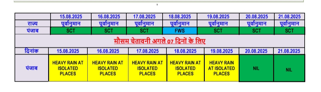 ਜਦੋਂਕਿ ਹਿਮਾਚਲ ਪ੍ਰਦੇਸ਼ ਦੇ ਨਾਲ ਲਗਦੇ ਜ਼ਿਲ੍ਹਿਆਂ (ਪਠਾਨਕੋਟ, ਗੁਰਦਾਸਪੁਰ, ਰੋਪੜ, ਹੁਸ਼ਿਆਰਪੁਰ, ਮੋਹਾਲੀ ਅਤੇ ਚੰਡੀਗੜ੍ਹ) ਵਿੱਚ ਭਾਰੀ ਬਾਰਿਸ਼ ਹੋਵੇਗੀ।