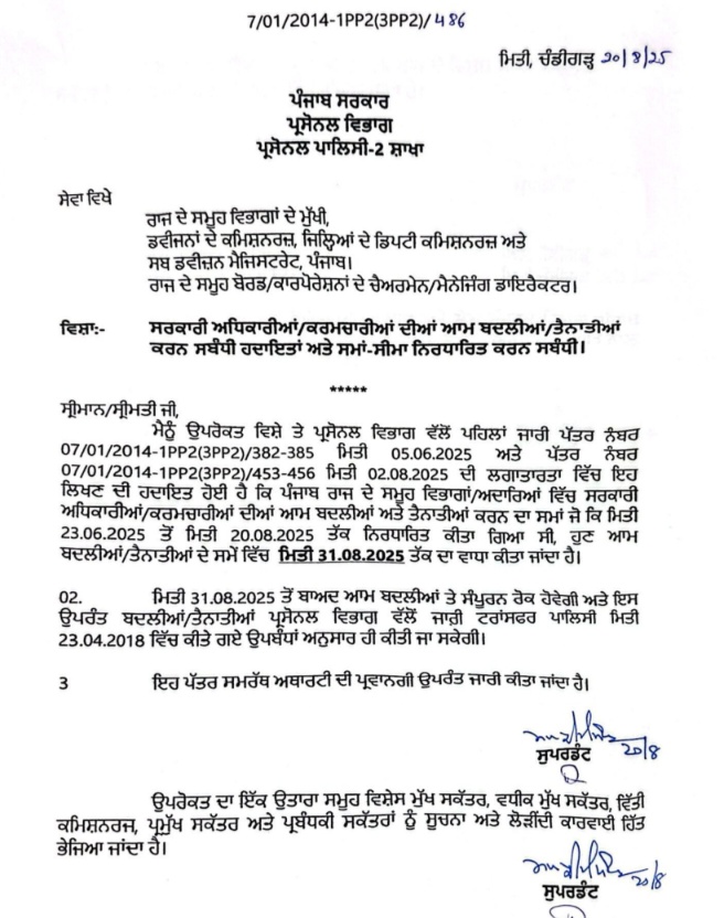 ਪਰਸੋਨਲ ਵਿਭਾਗ ਦੇ ਸੁਪਰਡੈਂਟ ਵੱਲੋਂ ਜਾਰੀ ਕੀਤੇ ਗਏ ਇਸ ਪੱਤਰ ਵਿੱਚ ਕਿਹਾ ਗਿਆ ਹੈ ਕਿ, ਉਸ ਨੂੰ ਸਰਕਾਰ ਵੱਲੋਂ ਲਿਖਣ ਦੀ ਹਦਾਇਤ ਹੋਈ ਹੈ ਕਿ ਪੰਜਾਬ ਰਾਜ ਦੇ ਸਮੂਹ ਵਿਭਾਗਾਂ/ਅਦਾਰਿਆਂ ਵਿੱਚ ਸਰਕਾਰੀ ਅਧਿਕਾਰੀਆਂ/ਕਰਮਚਾਰੀਆਂ ਦੀਆਂ ਆਮ ਬਦਲੀਆਂ ਅਤੇ ਤੈਨਾਤੀਆਂ ਕਰਨ ਦਾ ਸਮਾਂ ਜੋ ਕਿ ਮਿਤੀ 23.06.2025 ਤੋਂ 20.08.2025 ਤੱਕ ਨਿਰਧਾਰਿਤ ਕੀਤਾ ਗਿਆ ਸੀ। ਹੁਣ ਇਨਾਂ ਆਮ ਬਦਲੀਆਂ/ਤੈਨਾਤੀਆਂ ਦੇ ਸਮੇਂ ਵਿੱਚ ਮਿਤੀ 31.08.2025 ਤੱਕ ਦਾ ਵਾਧਾ ਕੀਤਾ ਜਾਂਦਾ ਹੈ।
