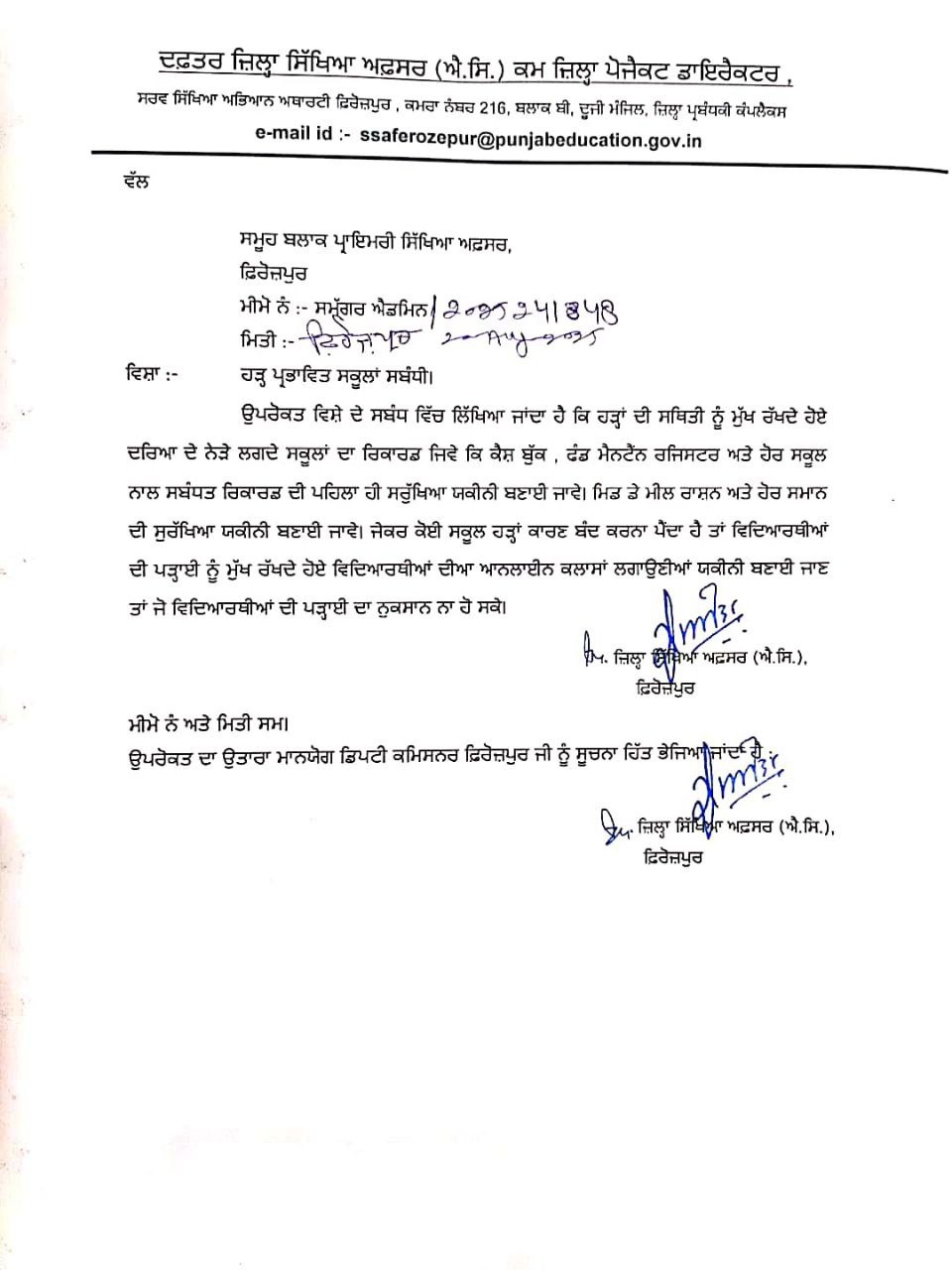ਡੀਈਓ ਨੇ ਸਮੂਹ ਬੀਪੀਈਓ ਨੂੰ ਲਿਖਿਆ ਹੈ ਕਿ ਹੜ੍ਹਾਂ ਦੀ ਸਥਿਤੀ ਨੂੰ ਮੁੱਖ ਰੱਖਦੇ ਹੋਏ ਸਤਲੁਜ ਦਰਿਆ ਦੇ ਨੇੜੇ ਲੱਗਦੇ ਸਕੂਲਾਂ ਦਾ ਰਿਕਾਰਡ ਜਿਵੇਂ ਕਿ ਕੈਸ਼ ਬੁੱਕ, ਫੰਡ ਮੈਨਟੈਨ ਰਜਿਸਟਰ ਅਤੇ ਹੋਰ ਸਕੂਲ ਨਾਲ ਸਬੰਧਤ ਰਿਕਾਰਡ ਦੀ ਪਹਿਲਾ ਦੇ ਆਧਾਰ ਤੇ ਸੁਰੱਖਿਆ ਯਕੀਨੀ ਬਣਾਈ ਜਾਵੇ।
