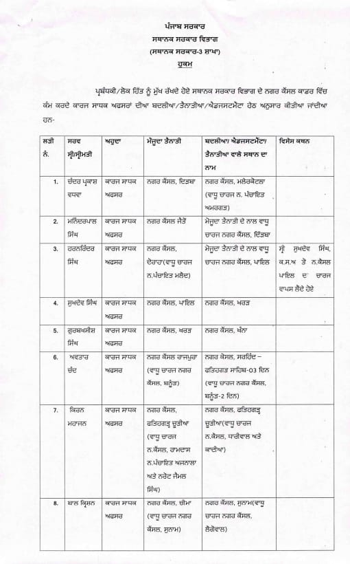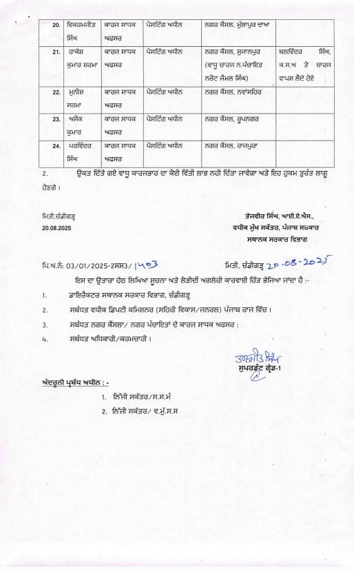 ਪੰਜਾਬ ਸਰਕਾਰ ਵੱਲੋਂ 24 ਅਫ਼ਸਰਾਂ ਦੀਆਂ ਬਦਲੀਆਂ, ਪੜ੍ਹੋ ਲਿਸਟ All Latest NewsNews FlashPunjab NewsTOP STORIES August 20, 2025 Media PBN Staff Punjab Transfers News: ਪੰਜਾਬ ਸਰਕਾਰ ਦੇ ਵੱਲੋਂ 24 ਕਾਰਜ ਸਾਧਕ ਅਫ਼ਸਰਾਂ ਦੀਆਂ ਬਦਲੀਆਂ ਕੀਤੀਆਂ ਗਈਆਂ ਹਨ। ਹੇਠਾਂ ਪੜ੍ਹੋ ਲਿਸਟ