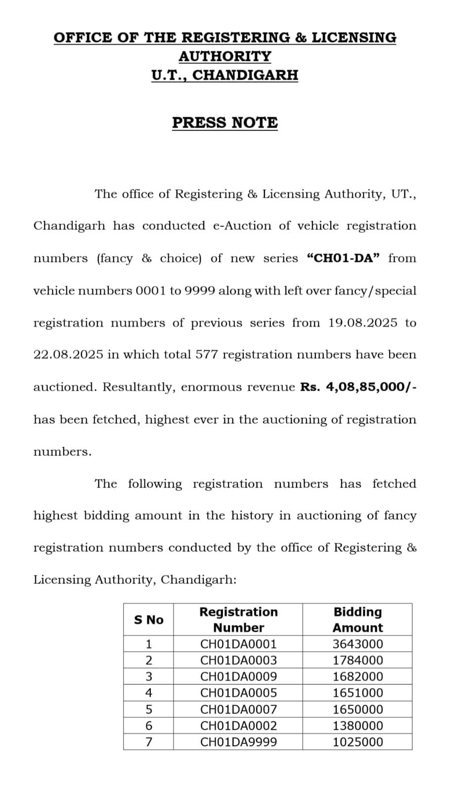CH-01-DA-0001 ਹੁਣ ਤੱਕ ਦਾ ਸਭ ਤੋਂ ਮਹਿੰਗਾ ਫੈਂਸੀ ਨੰਬਰ ਬਣ ਗਿਆ ਹੈ। CH-01-DA-0003 ਨੰਬਰ 17 ਲੱਖ 84 ਹਜ਼ਾਰ ਰੁਪਏ ਵਿੱਚ ਨਿਲਾਮ ਹੋਇਆ ਹੈ।