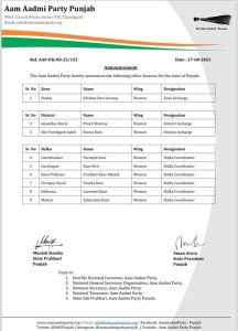 Chandigarh: The Aam Aadmi Party (AAP) has strengthened its organizational structure in Punjab by announcing the new office-bearers of its Women Wing.