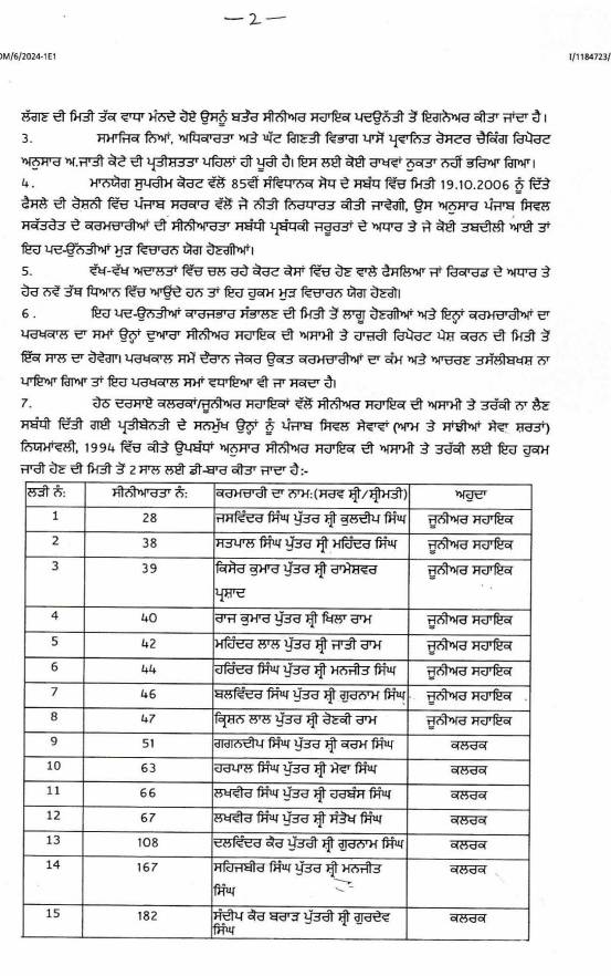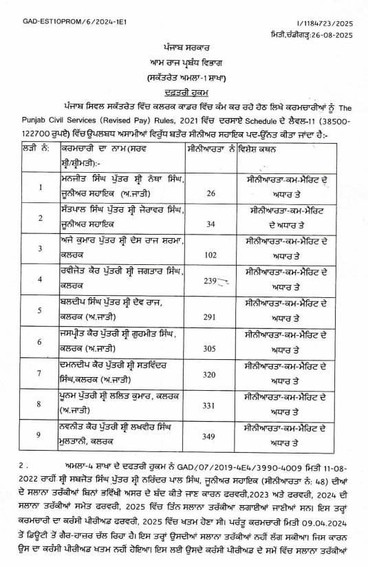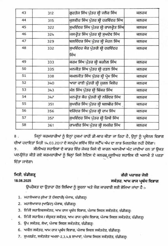 ਪੰਜਾਬ ਸਿਵਲ ਸਕੱਤਰੇਤ ਦੇ 9 ਕਲਰਕਾਂ ਨੂੰ ਮਿਲੀ ਤਰੱਕੀ! 58 ਮੁਲਾਜ਼ਮ ਕੀਤੇ ਡੀ-ਬਾਰ; ਪੜ੍ਹੋ ਲਿਸਟ All Latest NewsNews FlashPunjab News August 28, 2025 Media PBN Staff Punjab News: – ਪੰਜਾਬ ਸਿਵਲ ਸਕੱਤਰੇਤ ਦੇ 9 ਕਲਰਕਾਂ ਨੂੰ ਤਰੱਕੀ ਦੇ ਕੇ ਸਰਕਾਰ ਵੱਲੋਂ ਸੀਨੀਅਰ ਸਹਾਇਕ ਬਣਾਇਆ ਗਿਆ ਹੈ। ਜਦੋਂਕਿ 58 ਮੁਲਾਜ਼ਮਾਂ ਨੂੰ ਡੀਬਾਰ ਕੀਤਾ ਗਿਆ ਹੈ। ਹੇਠਾਂ ਪੜ੍ਹੋ ਲਿਸਟ