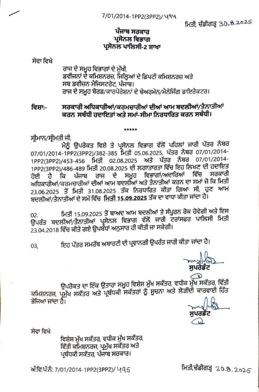 ਸਰਕਾਰ ਦੁਆਰਾ ਜਾਰੀ ਕੀਤੇ ਪੱਤਰ ਦੇ ਮੁਤਾਬਕ ਹੁਣ ਆਮ ਬਦਲੀਆਂ ਅਤੇ ਤੈਨਾਤੀਆਂ ਦੇ ਸਮੇਂ ਵਿੱਚ ਮਿਤੀ 15 ਸਤੰਬਰ 2025 ਤੱਕ ਵਾਧਾ ਕੀਤਾ ਗਿਆ ਹੈ। 15 ਸਤੰਬਰ ਤੋਂ ਬਾਅਦ ਆਮ ਬਦਲੀਆਂ ‘ਤੇ ਸੰਪੂਰਨ ਰੋਕ ਹੋਵੇਗੀ ਅਤੇ ਇਸ ਉਪਰੰਤ ਬਦਲੀਆਂ ਅਤੇ ਤੈਨਾਤੀਆਂ ਪਰਸੋਨਲ ਵਿਭਾਗ ਵੱਲੋਂ ਜਾਰੀ ਟਰਾਂਸਫਰ ਪਾਲਸੀ ਵਿੱਚ ਕੀਤੇ ਉਪਬੰਧਾਂ ਅਨੁਸਾਰ ਹੀ ਕੀਤੀ ਜਾ ਸਕੇਗੀ।