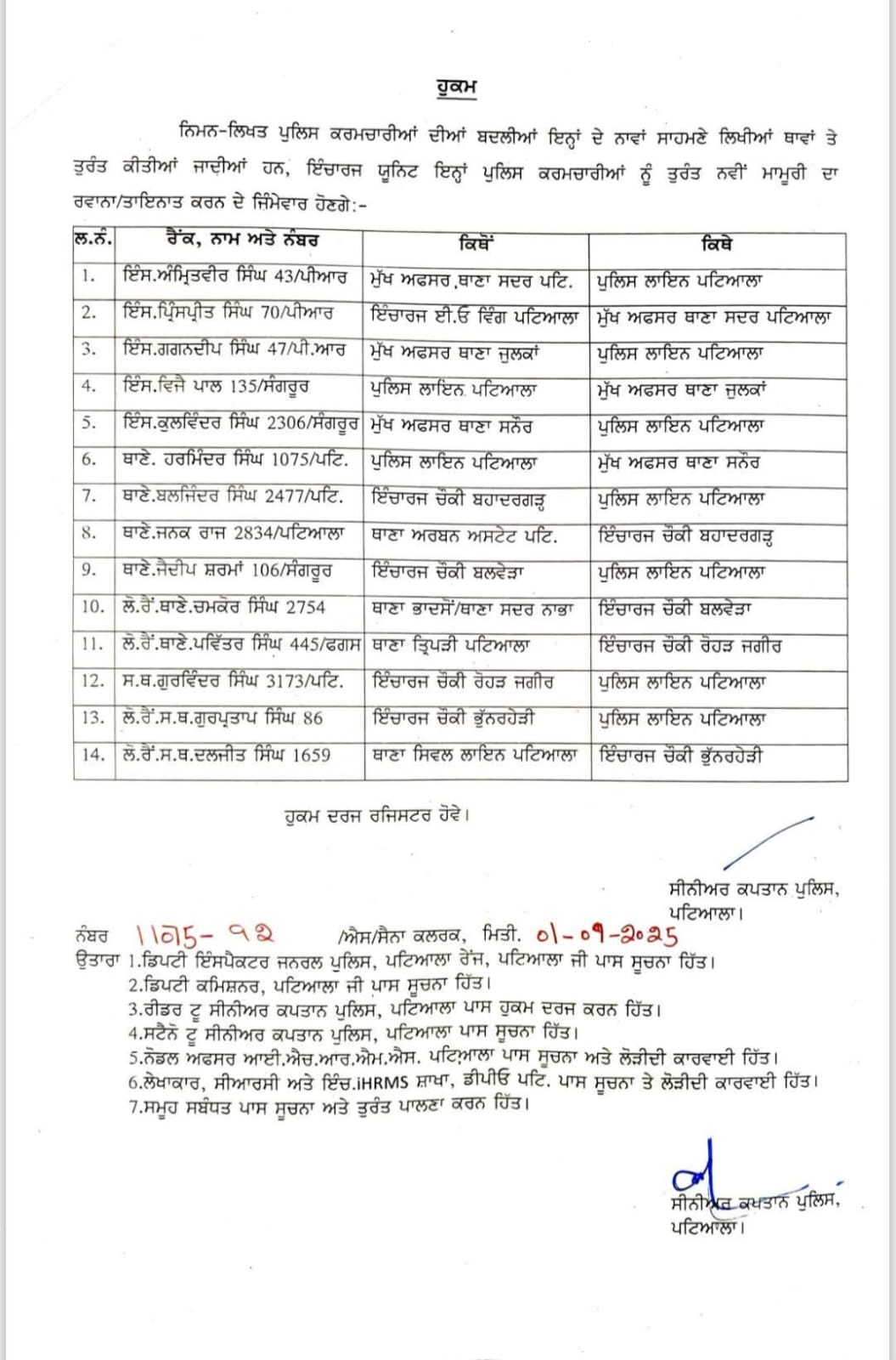 ਪੰਜਾਬ ਪੁਲਿਸ ਦੇ 5 ਇੰਸਪੈਕਟਰਾਂ ਸਮੇਤ 14 ਮੁਲਾਜ਼ਮਾਂ ਦਾ ਤਬਾਦਲਾ, ਪੜ੍ਹੋ ਲਿਸਟ All Latest NewsNews FlashPunjab News September 1, 2025 Media PBN Staff Punjab News; ਪੰਜਾਬ ਪੁਲਿਸ ਦੇ 5 ਇੰਸਪੈਕਟਰਾ ਸਮੇਤ 14 ਮੁਲਾਜ਼ਮਾਂ ਦਾ ਤਬਾਦਲਾ ਕੀਤਾ ਗਿਆ ਹੈ। ਹੇਠਾਂ ਪੜ੍ਹੋ ਲਿਸਟ