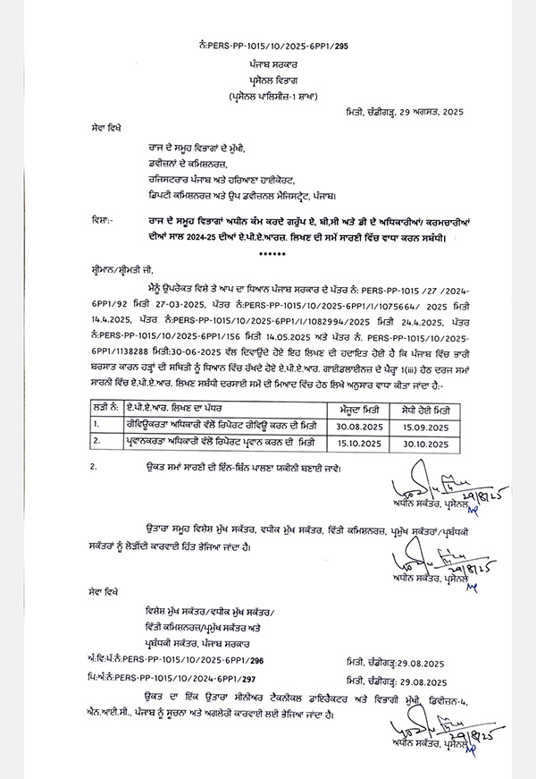 Punjab News: ਪੰਜਾਬ ਸਰਕਾਰ ਨੇ ਮੁਲਾਜ਼ਮਾਂ ਲਈ ਜਾਰੀ ਕੀਤੇ ਅਹਿਮ ਹੁਕਮ, APAR ਲਿਖਣ ਬਾਰੇ ਨਵਾਂ ਪੱਤਰ ਜਾਰੀ All Latest NewsNews FlashPunjab News September 1, 2025 Media PBN Staff Punjab News: ਪੰਜਾਬ ਸਰਕਾਰ ਵੱਲੋਂ ਸਮੂਹ ਵਿਭਾਗਾਂ ਦੇ ਗਰੁੱਪ-ਏ, ਬੀ, ਸੀ ਅਤੇ ਡੀ ਦੇ ਅਧਿਕਾਰੀਆਂ ਤੇ ਕਰਮਚਾਰੀਆਂ ਦੀਆਂ ਸਾਲ 2024-25 ਦੀਆਂ ਏਪੀਏਆਰਜ਼ ਲਿਖਣ ਦੀ ਸਮੇਂ ਸਾਰਣ. ਵਿੱਚ ਵਾਧਾ ਕੀਤਾ ਗਿਆ ਹੈ। ਹੇਠਾਂ ਪੜ੍ਹੋ ਪੱਤਰ