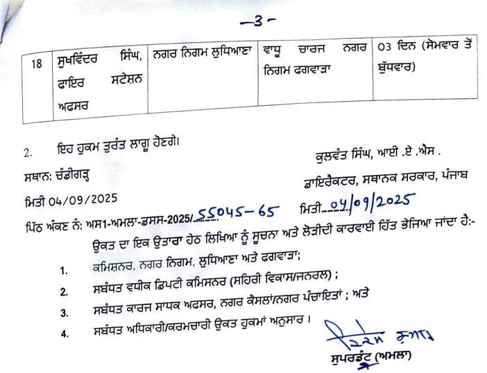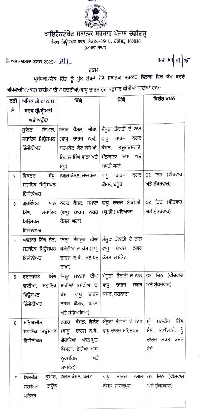 ਪੰਜਾਬ ਸਰਕਾਰ ਵੱਲੋਂ 18 ਅਧਿਕਾਰੀਆਂ ਅਤੇ ਕਰਮਚਾਰੀਆਂ ਦਾ ਤਬਾਦਲਾ, ਪੜ੍ਹੋ ਲਿਸਟ All Latest NewsNews FlashPunjab News September 4, 2025 Media PBN Staff Punjab News: ਪੰਜਾਬ ਸਰਕਾਰ ਦੇ ਵੱਲੋਂ ਸਥਾਨਕ ਸਰਕਾਰ ਵਿਭਾਗ ਦੇ 18 ਅਧਿਕਾਰੀਆਂ ਅਤੇ ਕਰਮਚਾਰੀਆਂ ਦਾ ਤਬਾਦਲਾ ਕੀਤਾ ਗਿਆ ਹੈ। ਹੇਠਾਂ ਪੜ੍ਹੋ ਲਿਸਟ