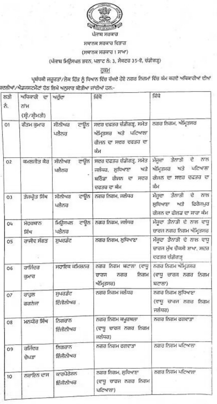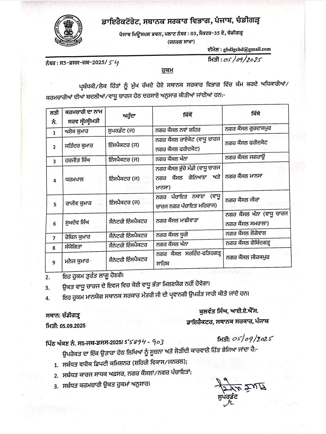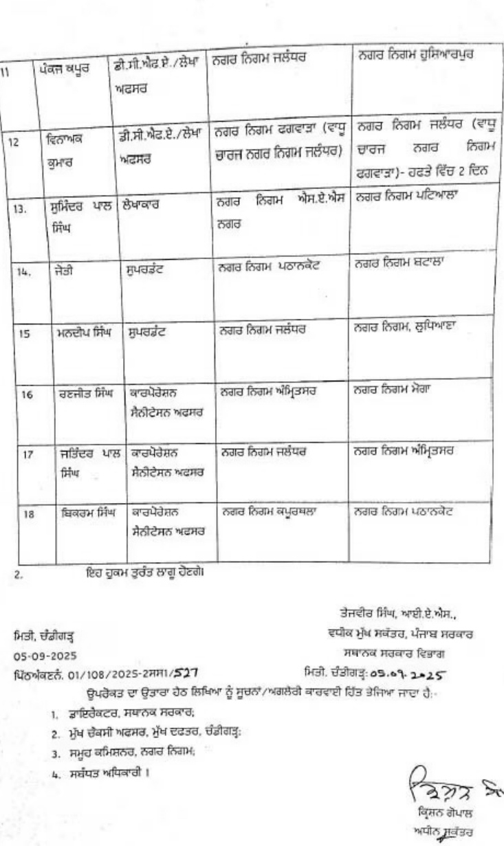Punjab News: ਪੰਜਾਬ ਸਰਕਾਰ ਵੱਲੋਂ 27 ਅਧਿਕਾਰੀਆਂ ਤੇ ਕਰਮਚਾਰੀਆਂ ਦਾ ਤਬਾਦਲਾ, ਪੜ੍ਹੋ ਲਿਸਟ All Latest NewsNews FlashPunjab News September 6, 2025 Media PBN Staff Punjab News: ਪੰਜਾਬ ਸਰਕਾਰ ਦੇ ਵੱਲੋਂ ਸਥਾਨਕ ਸਰਕਾਰ ਵਿਭਾਗ ਦੇ 27 ਅਧਿਕਾਰੀਆਂ ਤੇ ਕਰਮਚਾਰੀਆਂ ਦਾ ਤਬਾਦਲਾ ਕੀਤਾ ਗਿਆ ਹੈ। ਹੇਠਾਂ ਪੜ੍ਹੋ ਲਿਸਟ