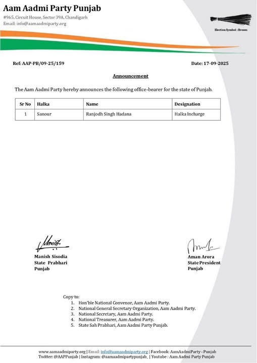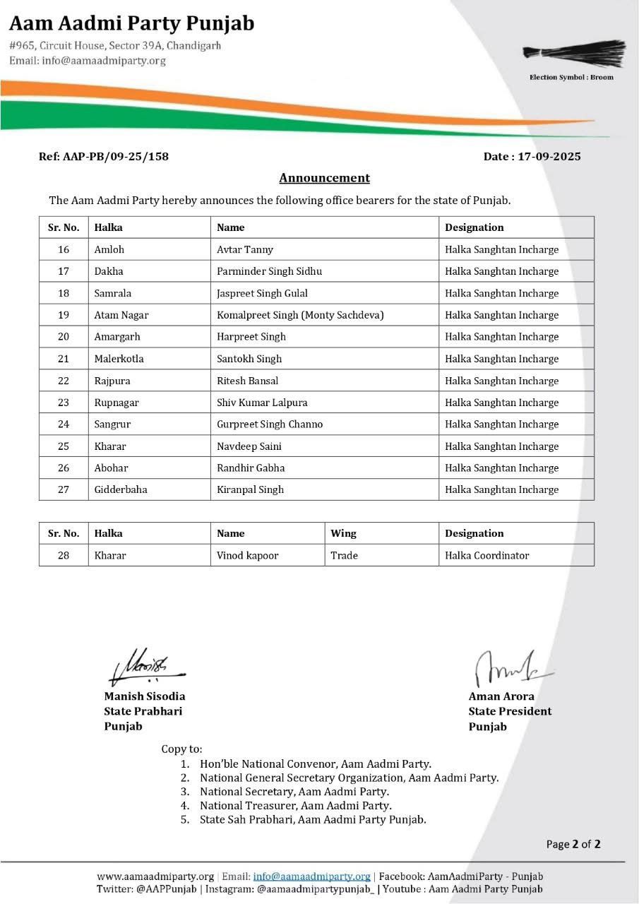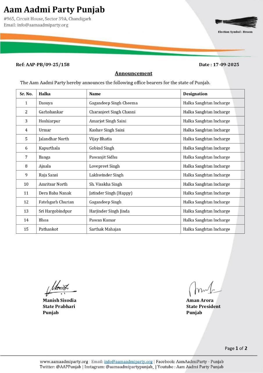 Breaking: AAP ਪੰਜਾਬ ਵੱਲੋਂ 28 ਹਲਕਾ ਇੰਚਾਰਜਾਂ ਦਾ ਐਲਾਨ, ਪੜ੍ਹੋ ਲਿਸਟ
