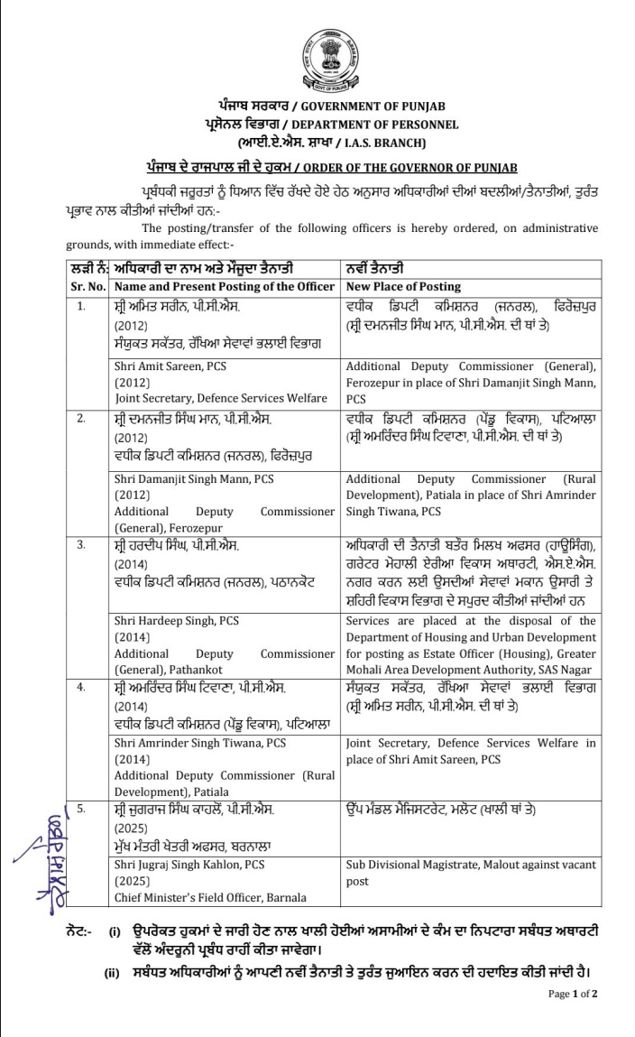 ਵੱਡੀ ਖ਼ਬਰ: ਪੰਜਾਬ ਸਰਕਾਰ ਵੱਲੋਂ 5 PCS ਅਫ਼ਸਰਾਂ ਦਾ ਤਬਾਦਲਾ, ਪੜ੍ਹੋ ਲਿਸਟ All Latest NewsNews FlashPunjab NewsTop BreakingTOP STORIES September 19, 2025 Media PBN Staff Punjab News- ਪੰਜਾਬ ਸਰਕਾਰ ਦੇ ਵੱਲੋਂ 5 PCS ਅਫ਼ਸਰਾਂ ਦਾ ਤਬਾਦਲਾ ਕੀਤਾ ਗਿਆ ਹੈ। ਹੇਠਾਂ ਪੜ੍ਹੋ ਲਿਸਟ