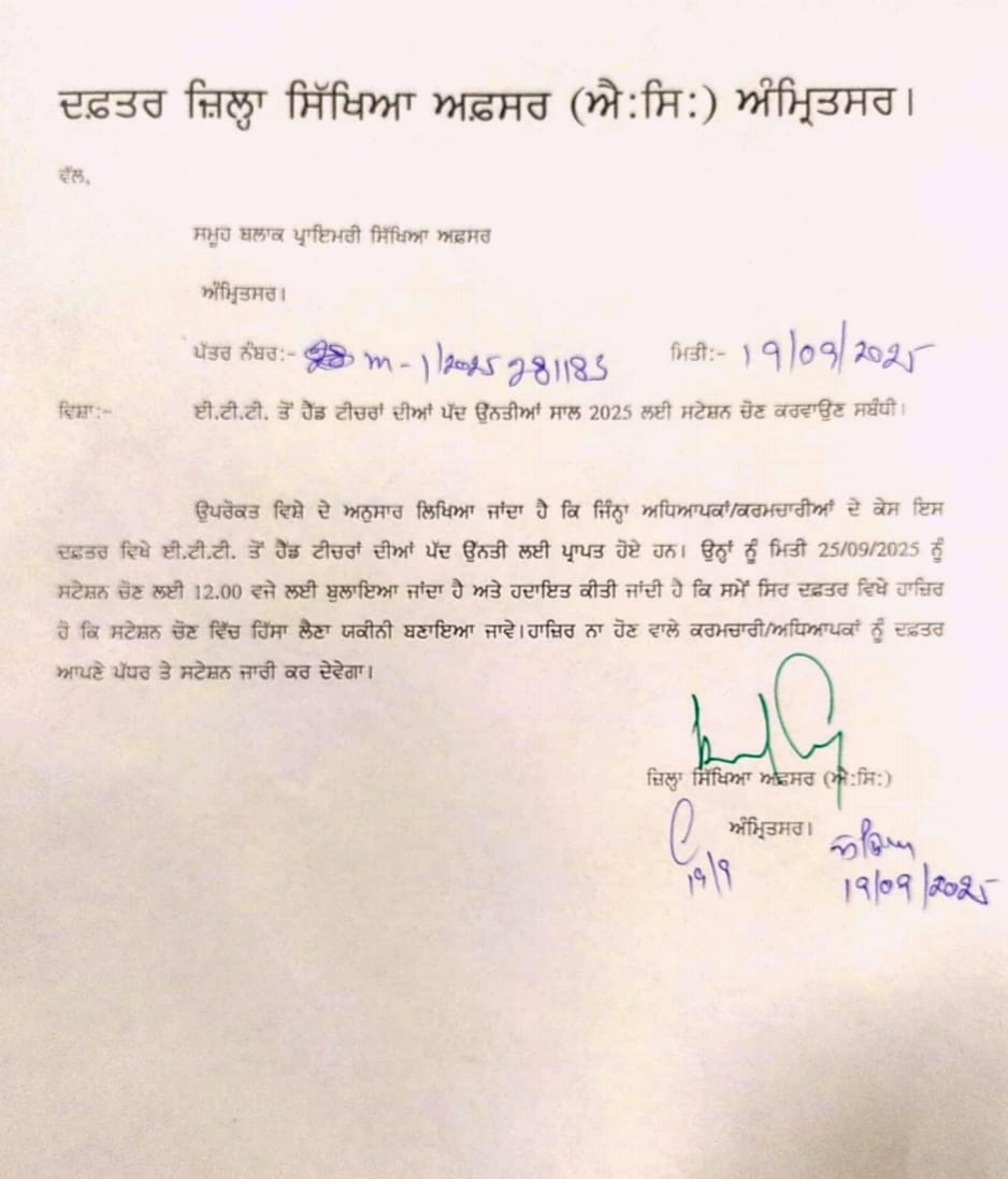 ਆਪਣੇ ਪੱਤਰ ਵਿੱਚ ਡੀਈਓ ਨੇ ਲਿਖਿਆ ਹੈ ਕਿ ਜਿਨ੍ਹਾਂ ਅਧਿਆਪਕਾਂ ਤੇ ਕਰਮਚਾਰੀਆਂ ਦੇ ਕੇਸ ਇਸ ਦਫ਼ਤਰ ਵਿਖੇ ਈਟੀਟੀ ਤੋਂ ਹੈੱਡ ਟੀਚਰਾਂ ਦੀਆਂ ਤਰੱਕੀਆਂ ਲਈ ਪ੍ਰਾਪਤ ਹੋਏ ਹਨ, ਉਨ੍ਹਾਂ ਨੂੰ ਮਿਤੀ 25 ਸਤੰਬਰ 2025 ਨੂੰ ਸਟੇਸ਼ਨ ਚੋਣ ਲਈ 12 ਵਜੇ ਤੱਕ ਬੁਲਾਇਆ ਜਾਂਦਾ ਹੈ।