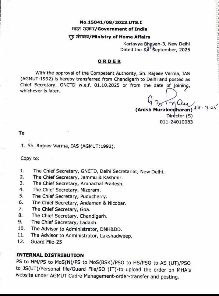 ਜਾਰੀ ਹੁਕਮਾਂ ਅਨੁਸਾਰ, ਸਰਕਾਰ ਦੇ ਵੱਲੋਂ ਚੀਫ਼ ਸੈਕਟਰੀ ਰਾਜੀਵ ਵਰਮਾ, 1992 ਬੈਚ ਦੇ ਏਜੀਐਮਯੂਟੀ ਕੇਡਰ ਦੇ ਆਈਏਐਸ ਅਧਿਕਾਰੀ ਦਾ ਚੰਡੀਗੜ੍ਹ ਤੋਂ ਦਿੱਲੀ ਤਬਾਦਲਾ ਕਰ ਦਿੱਤਾ ਹੈ।