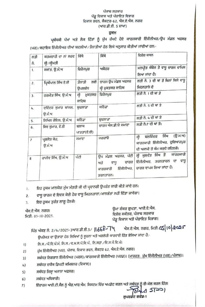 Punjab News- ਪੰਜਾਬ ਸਰਕਾਰ ਵੱਲੋਂ 8 ਅਧਿਕਾਰੀਆਂ ਤੇ ਕਰਮਚਾਰੀਆਂ ਦੀਆਂ ਬਦਲੀਆਂ All Latest NewsNews FlashPunjab NewsTop BreakingTOP STORIES October 6, 2025 Media PBN Staff Punjab News- ਪੰਜਾਬ ਸਰਕਾਰ ਦੇ ਵੱਲੋਂ ਪੇਂਡੂ ਵਿਕਾਸ ਤੇ ਪੰਚਾਇਤ ਵਿਭਾਗ ਦੇ 8 ਐਕਸੀਅਨ/ ਐਸਡੀਓਜ਼ ਤੇ ਜੇਈਜ਼ ਦੀਆਂ ਬਦਲੀਆਂ ਕੀਤੀਆਂ ਗਈਆਂ ਹਨ। ਹੇਠਾਂ ਪੜ੍ਹੋ ਲਿਸਟ
