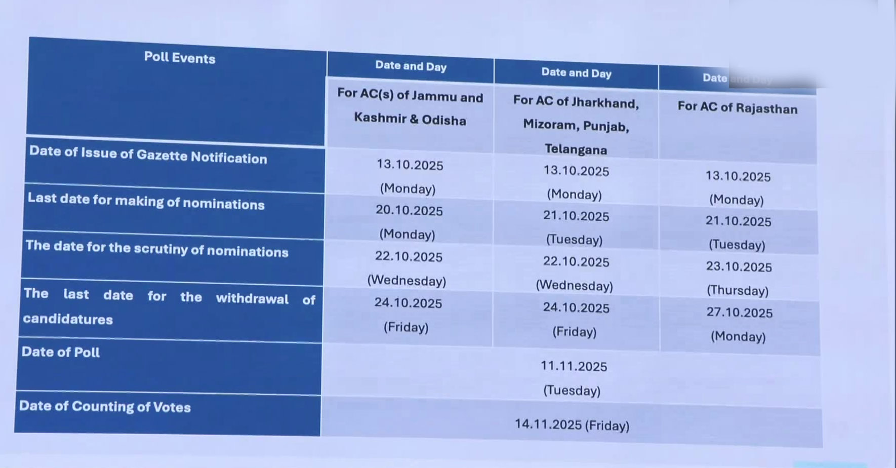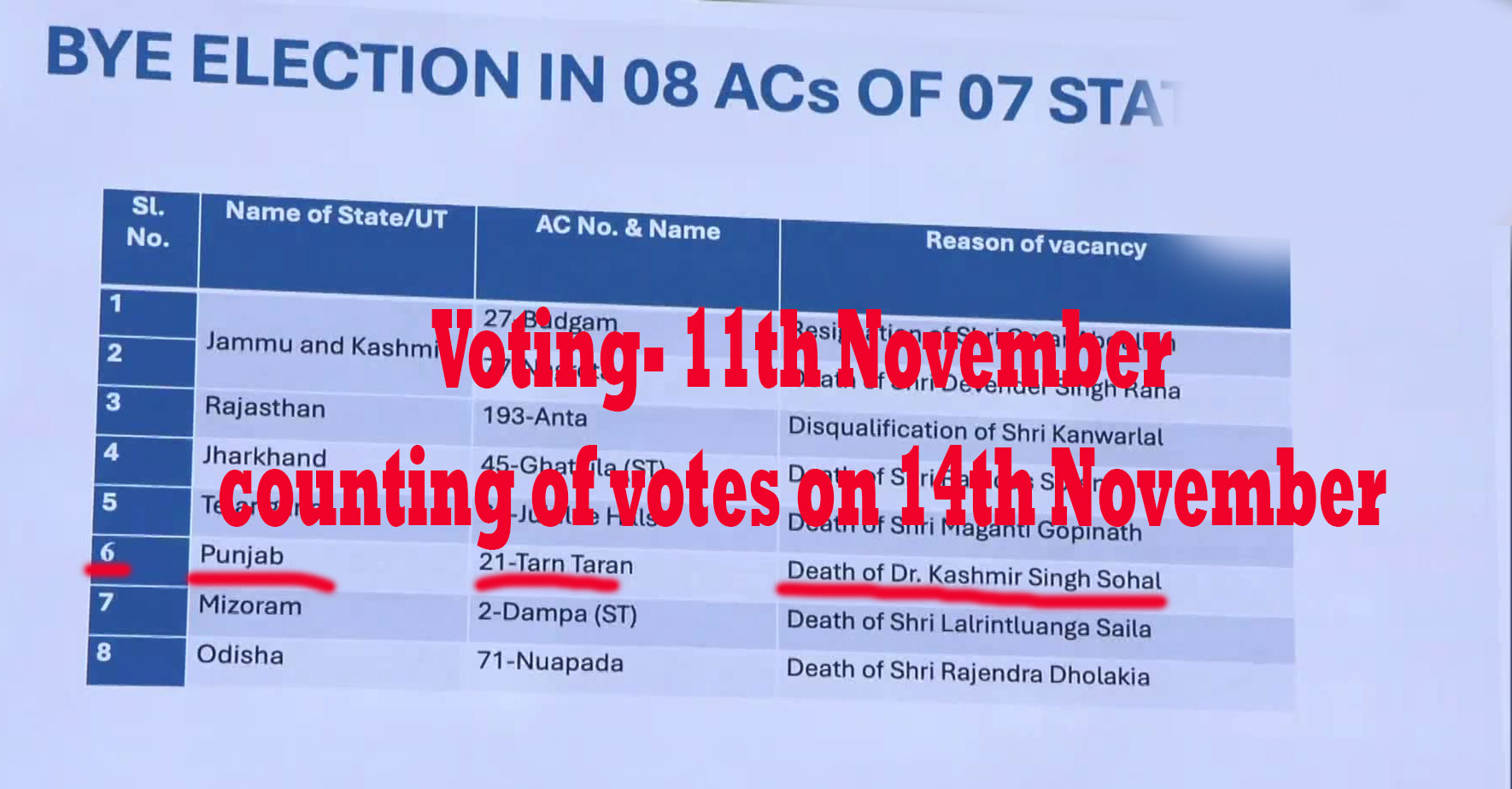 ਚੋਣ ਕਮਿਸ਼ਨ ਨੇ ਦੱਸਿਆ ਕਿ ਤਰਨਤਾਰਨ ਜ਼ਿਮਨੀ ਚੋਣ 11 ਨਵੰਬਰ ਨੂੰ ਹੋਵੇਗੀ, ਜਦੋਂਕਿ ਇਨ੍ਹਾਂ ਚੋਣਾਂ ਦਾ ਨਤੀਜਾ 14 ਨਵੰਬਰ ਨੂੰ ਆਵੇਗਾ।