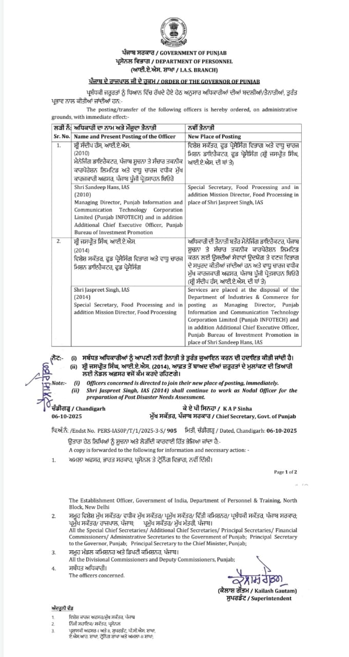 ਇਸ ਵਿੱਚ ਆਈਏਐਸ ਸੰਦੀਪ ਹੰਸ ਫੂਡ ਪ੍ਰੋਸੈਸਿੰਗ ਵਿਭਾਗ ਦੇ ਵਿਸ਼ੇਸ਼ ਸਕੱਤਰ ਦੀ ਜ਼ਿੰਮੇਵਾਰੀ ਸੰਭਾਲਣਗੇ, ਨਾਲ ਹੀ ਫੂਡ ਪ੍ਰੋਸੈਸਿੰਗ ਮਿਸ਼ਨ ਦੇ ਡਾਇਰੈਕਟਰ ਦੀ ਜ਼ਿੰਮੇਵਾਰੀ ਵੀ ਸੰਭਾਲਣਗੇ। ਇਹ ਜ਼ਿੰਮੇਵਾਰੀ ਪਹਿਲਾਂ ਆਈਏਐਸ ਜਸਪ੍ਰੀਤ ਸਿੰਘ ਕੋਲ ਸੀ।