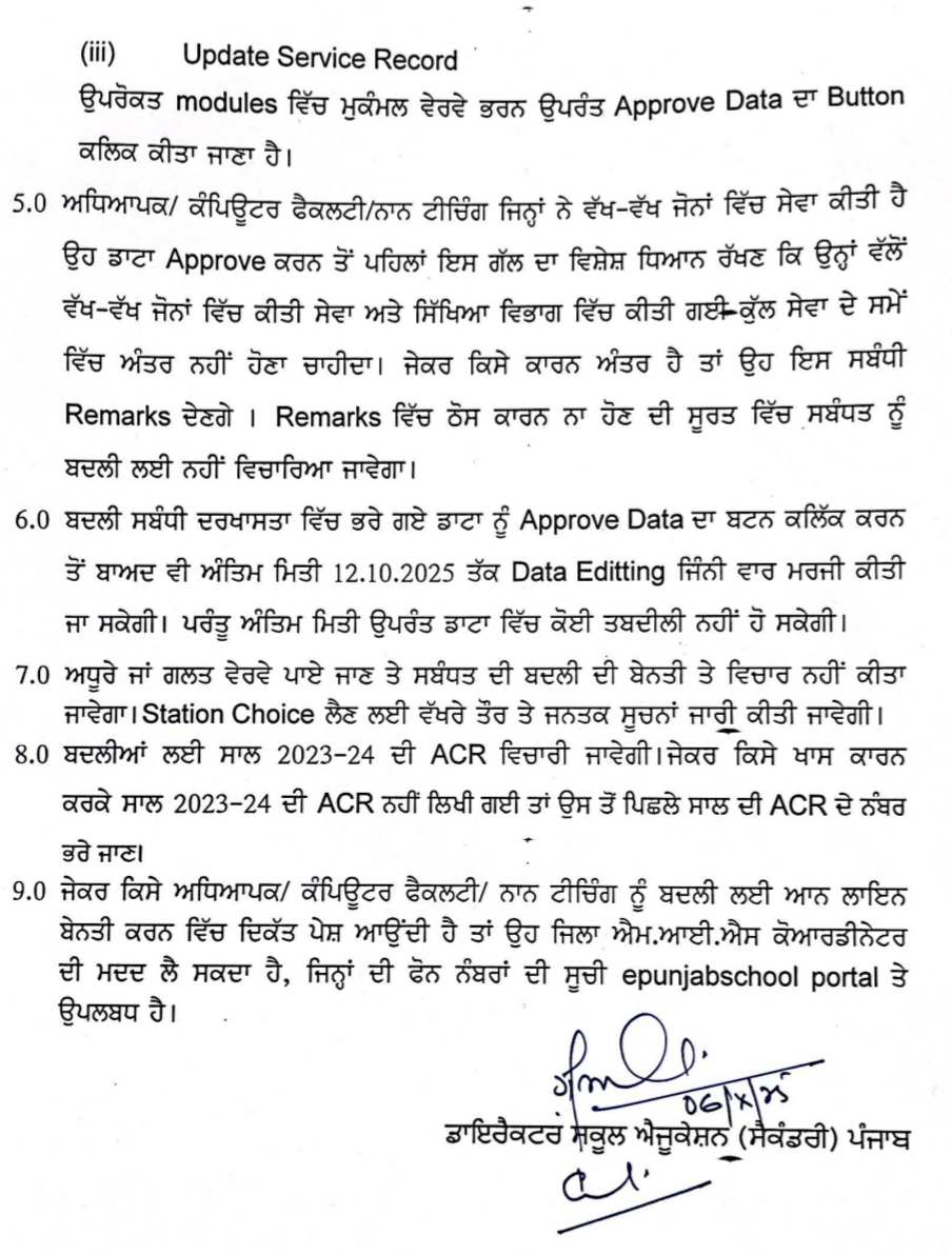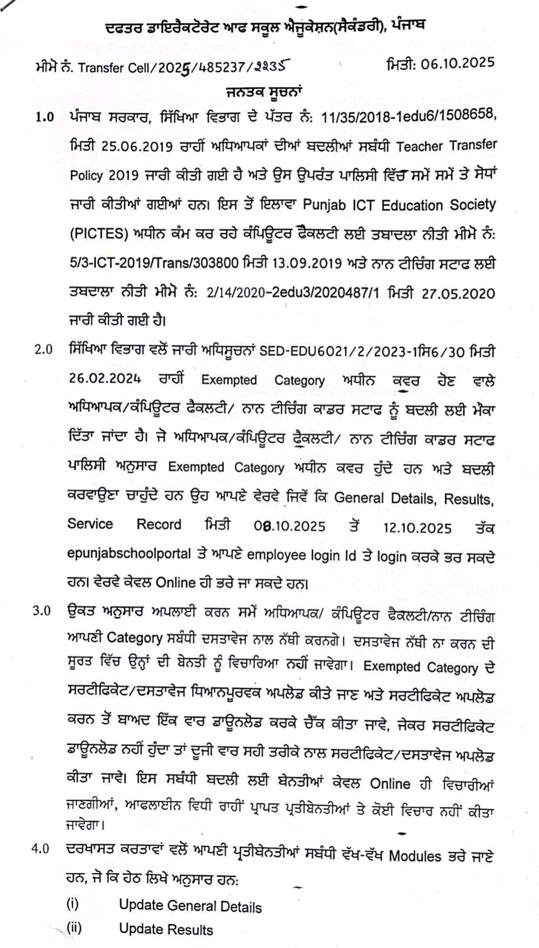 Exempted category ਅਧੀਨ ਕਵਰ ਹੋਣ ਵਾਲੇ ਅਧਿਆਪਕਾਂ ਕੰਪਿਊਟਰ ਫੈਕਲਟੀ ਨਾਨ ਟੀਚਿੰਗ ਸਟਾਫ ਕਾਡਰ ਨੂੰ ਬਦਲੀਆਂ ਕਰਾਉਣ ਦਾ ਮੌਕਾ ਦਿੱਤਾ ਗਿਆ ਹੈ। ਇਹ ਸਾਰੇ ਮੁਲਾਜ਼ਮ ਅੱਠ ਅਕਤੂਬਰ ਤੋਂ 12 ਅਕਤੂਬਰ ਤੱਕ ਬਦਲੀਆਂ ਅਪਲਾਈ ਕਰ ਸਕਣਗੇ।