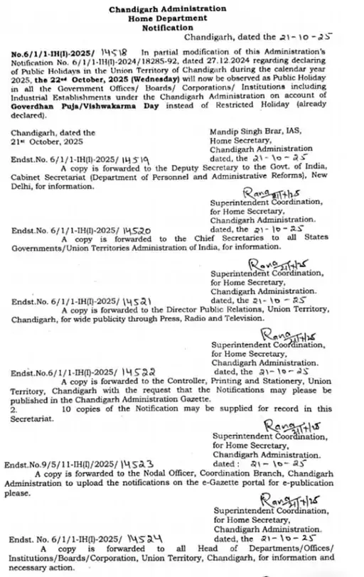 ਚੰਡੀਗੜ੍ਹ ਪ੍ਰਸ਼ਾਸਨ ਨੇ ਮੰਗਲਵਾਰ (21 ਅਕਤੂਬਰ) ਨੂੰ ਇੱਕ ਨੋਟੀਫਿਕੇਸ਼ਨ ਜਾਰੀ ਕੀਤਾ ਹੈ।