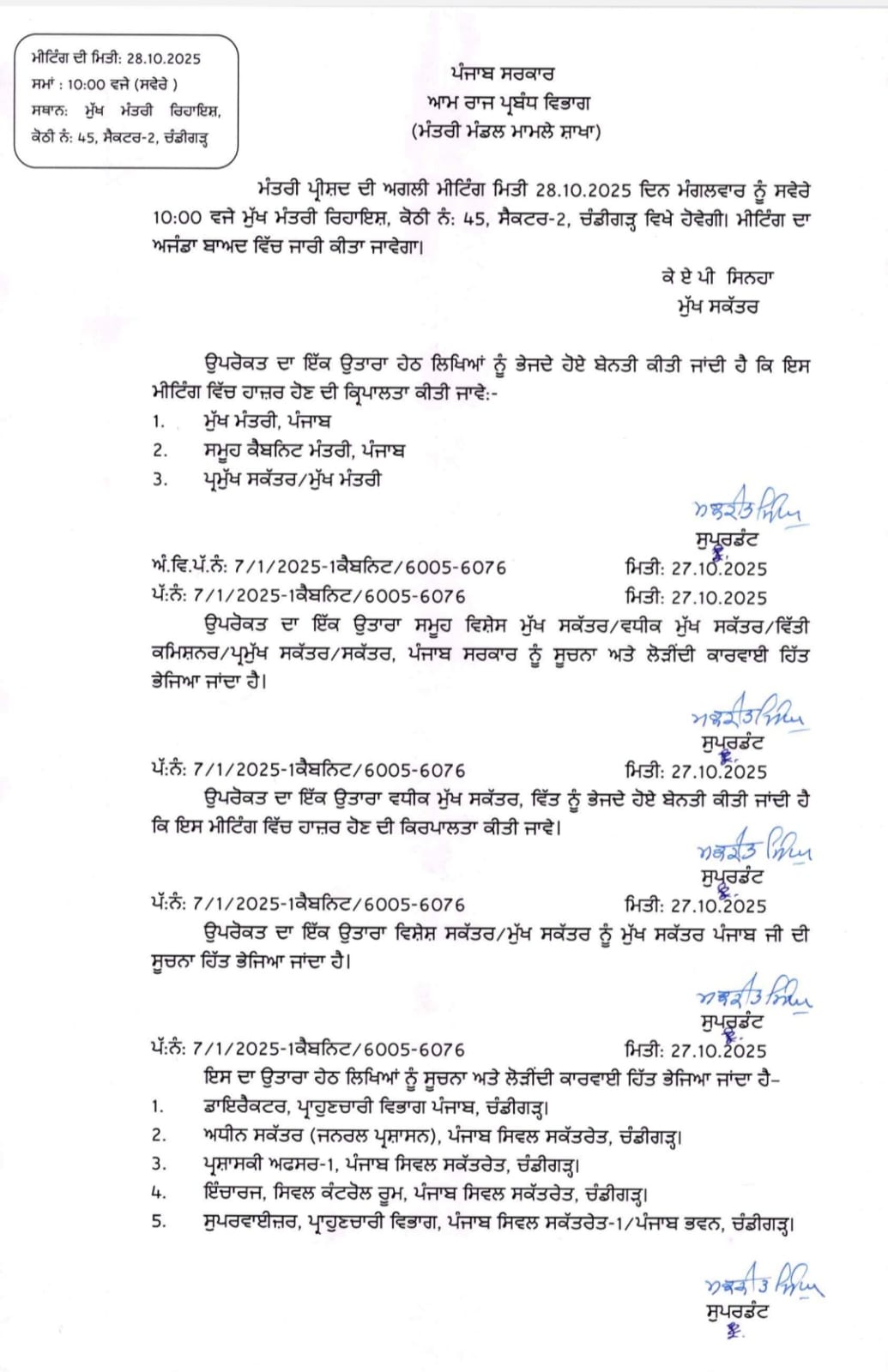 Punjab Cabinet Meeting- ਪੰਜਾਬ ਕੈਬਿਨਟ ਦੀ 28 ਅਕਤੂਬਰ ਨੂੰ ਅਹਿਮ ਮੀਟਿੰਗ ਹੋਣ ਜਾ ਰਹੀ ਹੈ। ਇਹ ਮੀਟਿੰਗ ਮੁੱਖ ਮੰਤਰੀ ਦੀ ਰਿਹਾਇਸ਼ ਚੰਡੀਗੜ੍ਹ ਵਿਖੇ ਸਵੇਰੇ 10 ਵਜੇ ਹੋਵੇਗੀ।