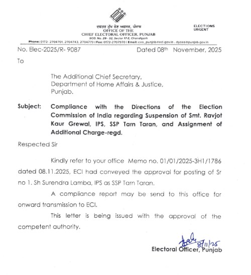 ਵੱਡੀ ਖ਼ਬਰ: ਪੰਜਾਬ ਦੇ ਇਸ ਜ਼ਿਲ੍ਹੇ ਨੂੰ ਮਿਲਿਆ ਨਵਾਂ SSP All Latest NewsNews FlashPunjab NewsTop BreakingTOP STORIES November 8, 2025 Media PBN Staff Punjab News- ਪੰਜਾਬ ਚੋਣ ਕਮਿਸ਼ਨ ਦੇ ਵੱਲੋਂ ਅੱਜ ਤਰਨਤਾਰਨ ਦੀ ਐਸਐਸਪੀ ਡਾ. ਰਵਜੋਤ ਕੌਰ ਗਰੇਵਾਲ ਨੂੰ ਸਸਪੈਂਡ ਕਰ ਦਿੱਤਾ ਸੀ। ਹੁਣ ਐਸਐਸਪੀ ਤਰਨਤਾਰਨ ਨਾਲ ਜੁੜੀ ਤਾਜ਼ਾ ਖ਼ਬਰ ਸਾਹਮਣੇ ਆਈ ਹੈ ਕਿ, ਕਮਿਸ਼ਨ ਨੇ ਤਰਨਤਾਰਨ ਦਾ ਨਵਾਂ ਐਸਐਸਪੀ ਸੁਰੇਂਦਰ ਲਾਂਬਾ ਨੂੰ ਲਗਾ ਦਿੱਤਾ ਹੈ।