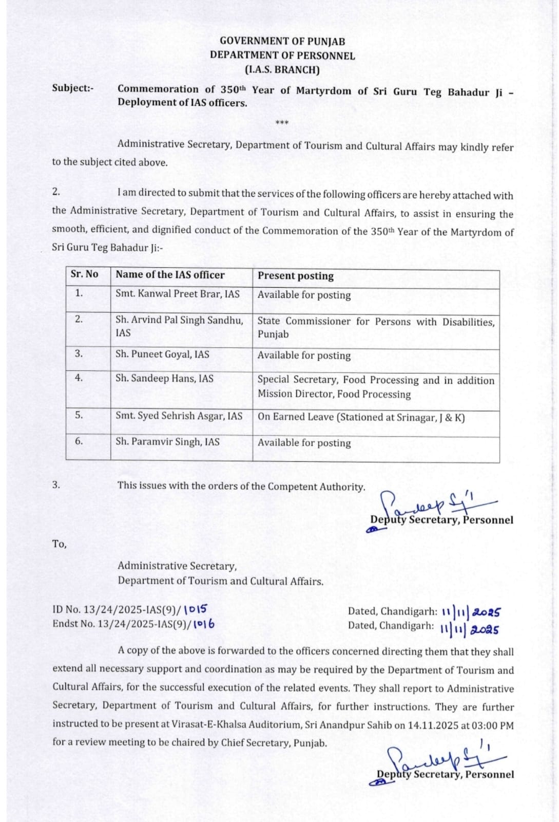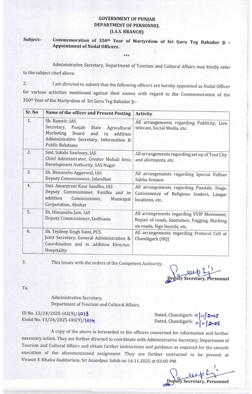 Punjab News- ਪੰਜਾਬ ਸਰਕਾਰ ਨੇ ਸ੍ਰੀ ਗੁਰੂ ਤੇਗ ਬਹਾਦਰ ਜੀ (Sri Guru Teg Bahadur Ji) ਦੇ 350ਵੇਂ ਸ਼ਹੀਦੀ ਦਿਵਸ ਦੇ ਸਬੰਧ ‘ਚ ਹੋਣ ਵਾਲੇ ਸਮਾਗਮਾਂ ਲਈ 12 IAS/PCS ਅਧਿਕਾਰੀਆਂ ਦੀ ਵਿਸ਼ੇਸ਼ ਤਾਇਨਾਤੀ ਕੀਤੀ ਹੈ।