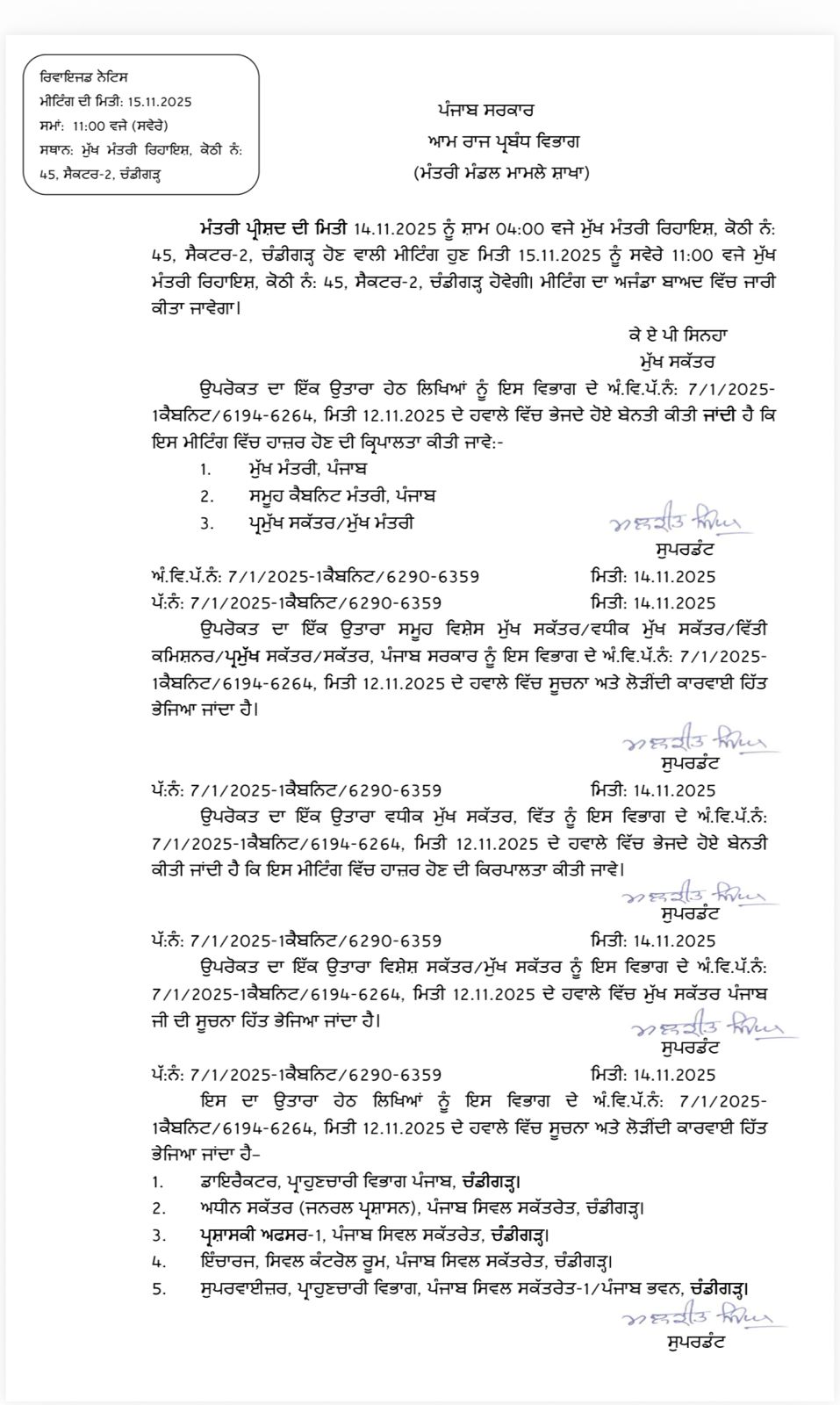 ਸਰਕਾਰ ਦੁਆਰਾ ਜਾਰੀ ਕੀਤੇ ਗਏ ਨੋਟੀਫਿਕੇਸ਼ਨ ਮੁਤਾਬਕ ਹੁਣ ਇਹ ਮੀਟਿੰਗ ਕੱਲ੍ਹ 15 ਨਵੰਬਰ 2025 ਨੂੰ ਸਵੇਰੇ 11 ਵਜੇ ਹੋਵੇਗੀ। ਇਹ ਮੀਟਿੰਗ ਸੀਐਮ ਭਗਵੰਤ ਮਾਨ ਦੀ ਰਿਹਾਇਸ਼ ਚੰਡੀਗੜ੍ਹ ਵਿਖੇ ਹੋਵੇਗੀ।