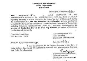ਚੰਡੀਗੜ੍ਹ, 22 ਨਵੰਬਰ 2025 (Media PBN)- Chandigarh Declares Holiday: ਸ਼੍ਰੀ ਗੁਰੂ ਤੇਗ ਬਹਾਦਰ ਸਾਹਿਬ ਜੀ ਦੇ 350ਵੇਂ ਸ਼ਹੀਦੀ ਪੁਰਬ (Guru Tegh Bahadur 350th martyrdom day) ਦੇ ਸਬੰਧ ਵਿੱਚ ਜਨਤਕ ਛੁੱਟੀ ਦਾ ਐਲਾਨ ਕੀਤਾ ਹੈ।