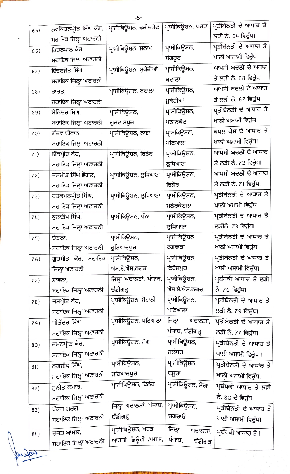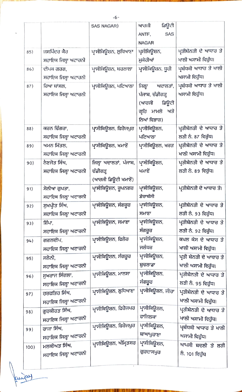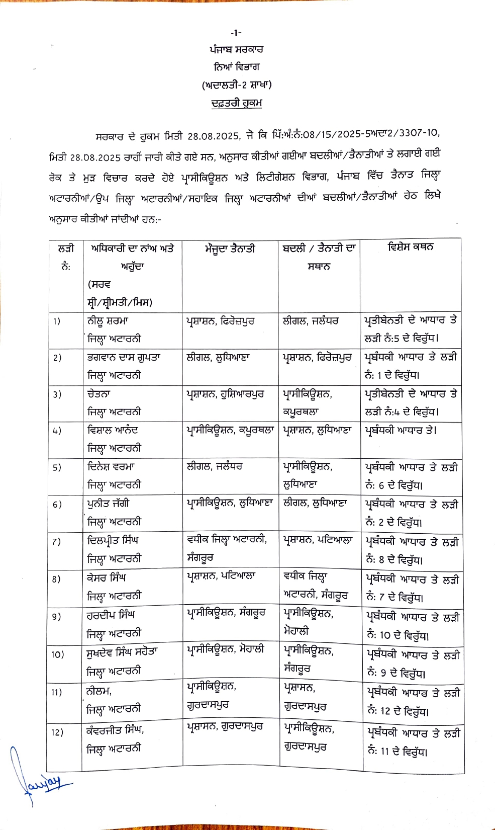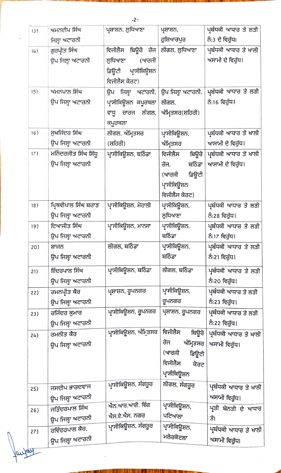 ਚੰਡੀਗੜ੍ਹ, 22 ਨਵੰਬਰ 2025- (Media PBN)- ਪੰਜਾਬ ਸਰਕਾਰ ਦੇ ਵੱਲੋਂ ਪ੍ਰਾਸੀਕਿਊਸ਼ਨ ਅਤੇ ਲਿਟੀਗੇਸ਼ਨ ਵਿਭਾਗ ਪੰਜਾਬ ਵਿੱਚ ਤੈਨਾਤ 106 ਜਿਲ੍ਹਾ ਅਟਾਰਨੀਆਂ ਅਤੇ ਉੱਪ ਜਿਲ੍ਹਾ ਅਟਾਰਨੀਆਂ ਤੋਂ ਇਲਾਵਾ ਸਹਾਇਕ ਜਿਲ੍ਹਾ ਅਟਾਰਨੀਆਂ ਦੀਆਂ ਬਦਲੀਆਂ ਕੀਤੀਆਂ ਗਈਆਂ ਹਨ।
