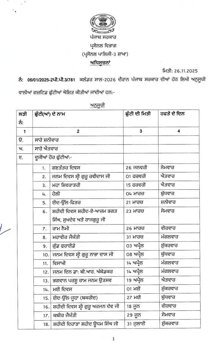 ਹੇਠਾਂ ਸਾਲ 2026 ਦੀਆਂ ਗਜ਼ਟਿਡ ਛੁੱਟੀਆਂ ਦੀ ਸੂਚੀ ਦਿੱਤੀ ਗਈ ਹੈ: