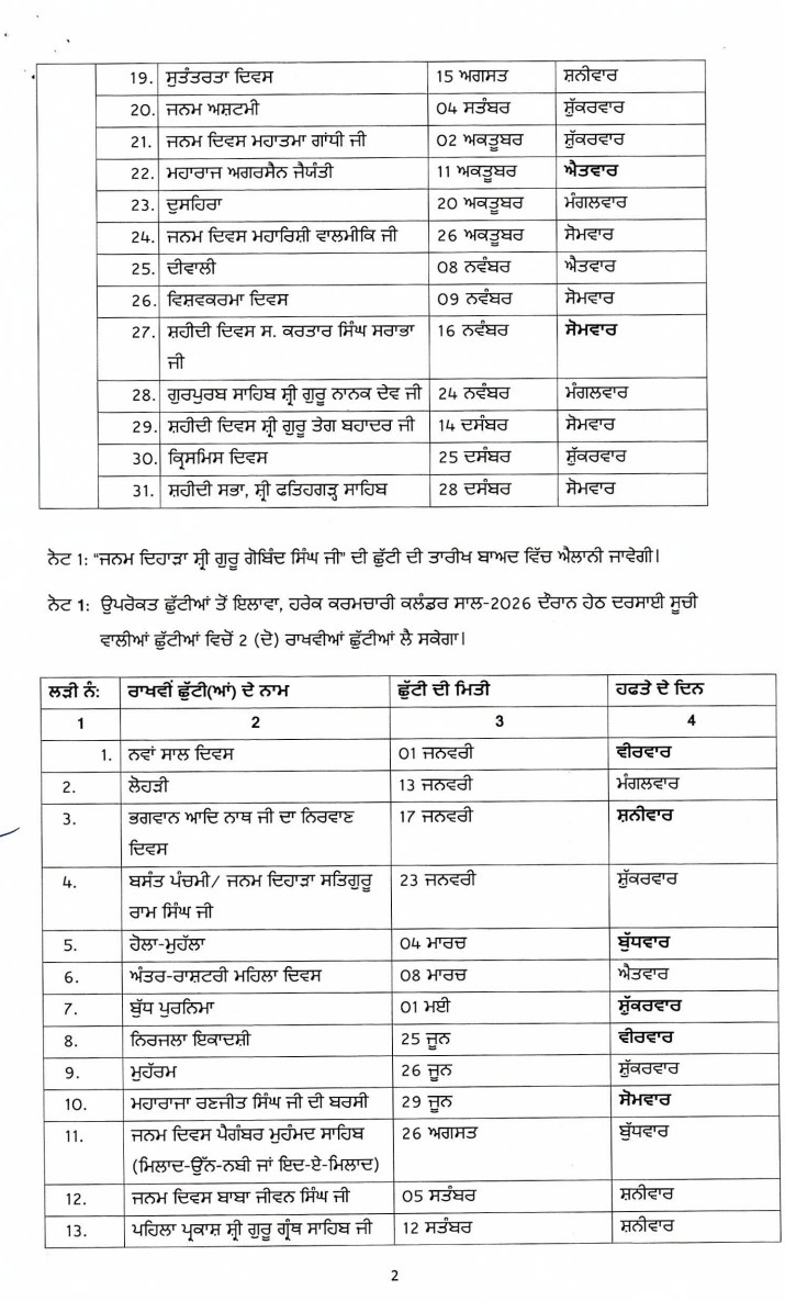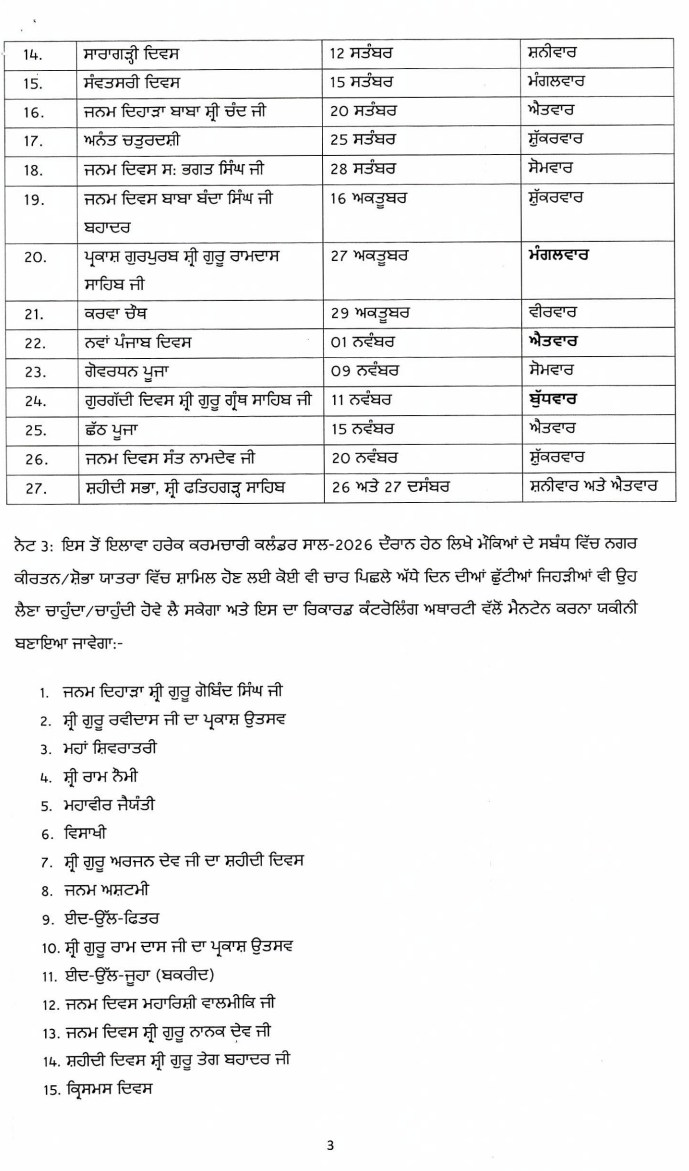 Holiday Breaking- ਚੰਡੀਗੜ੍ਹ, 26 ਨਵੰਬਰ 2025 (Media PBN) – ਪੰਜਾਬ ਸਰਕਾਰ ਦੇ ਵੱਲੋਂ ਅਗਾਮੀ ਸਾਲ 2026 ਲਈ ਗਜ਼ਟਿਡ ਛੁੱਟੀਆਂ ਦਾ ਐਲਾਨ ਕਰ ਦਿੱਤਾ ਗਿਆ ਹੈ।