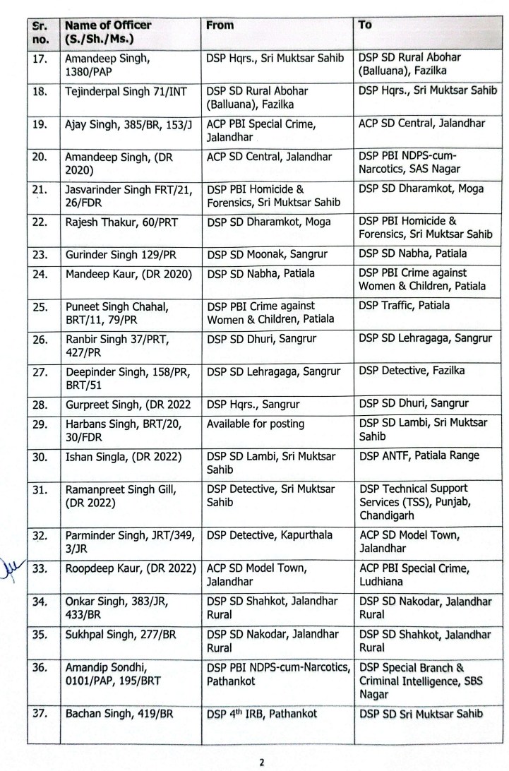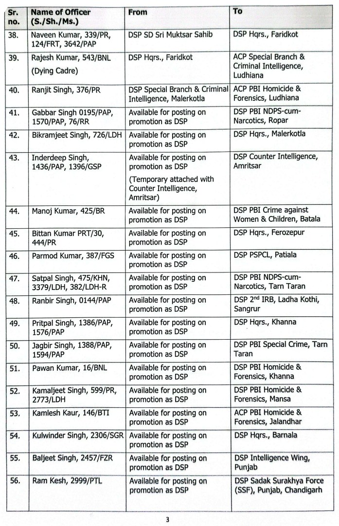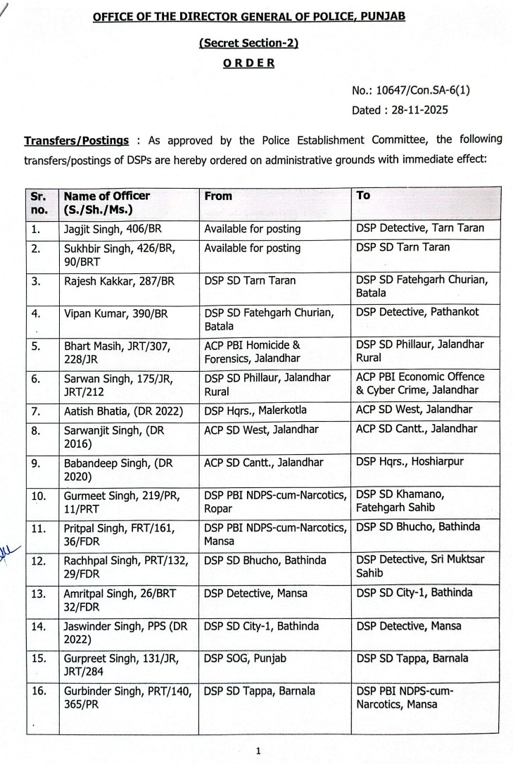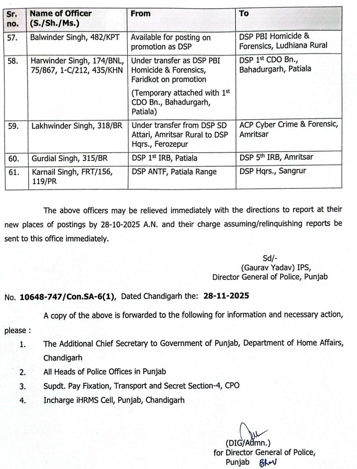 ਪੰਜਾਬ ਸਰਕਾਰ ਵੱਲੋਂ 61 DSPs ਦਾ ਤਬਾਦਲਾ, ਪੜ੍ਹੋ ਲਿਸਟ All Latest NewsNews FlashPunjab NewsTop BreakingTOP STORIES November 28, 2025 Media PBN Staff ਚੰਡੀਗੜ੍ਹ, 28 ਨਵੰਬਰ 2025 (Media PBN) – ਪੰਜਾਬ ਸਰਕਾਰ ਦੇ 61 ਡੀਐਸਪੀਜ਼ ਦਾ ਤਬਾਦਲਾ ਕੀਤਾ ਗਿਆ ਹੈ। ਹੇਠਾਂ ਪੜ੍ਹੋ ਲਿਸਟ