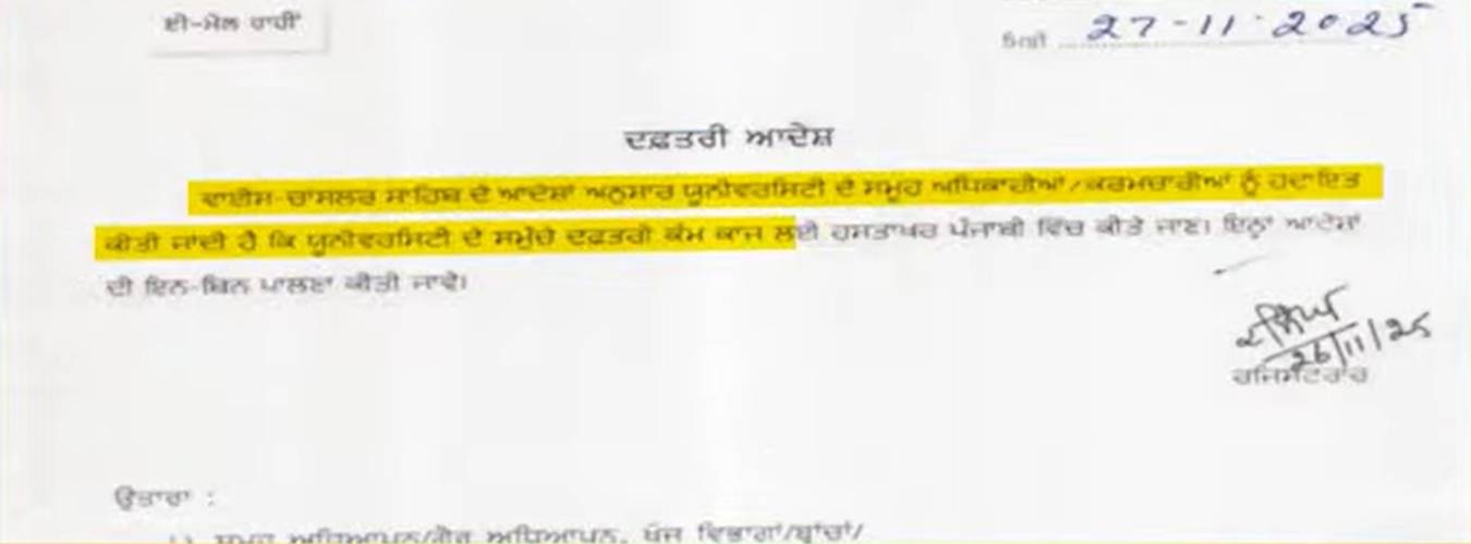 ਆਪਣੇ ਹੁਕਮਾਂ ਵਿੱਚ VC ਨੇ ਅਧਿਕਾਰੀਆਂ ਤੇ ਕਰਮਚਾਰੀਆਂ ਨੂੰ ਕਿਹਾ ਹੈ ਕਿ, ਯੂਨੀਵਰਸਿਟੀ ਦੇ ਸਮੁੱਚੇ ਦਫ਼ਤਰੀ ਕੰਮਕਾਜ ਲਈ ਹਸਤਾਖ਼ਰ ਪੰਜਾਬੀ ਵਿੱਚ ਕੀਤੇ ਜਾਣ।