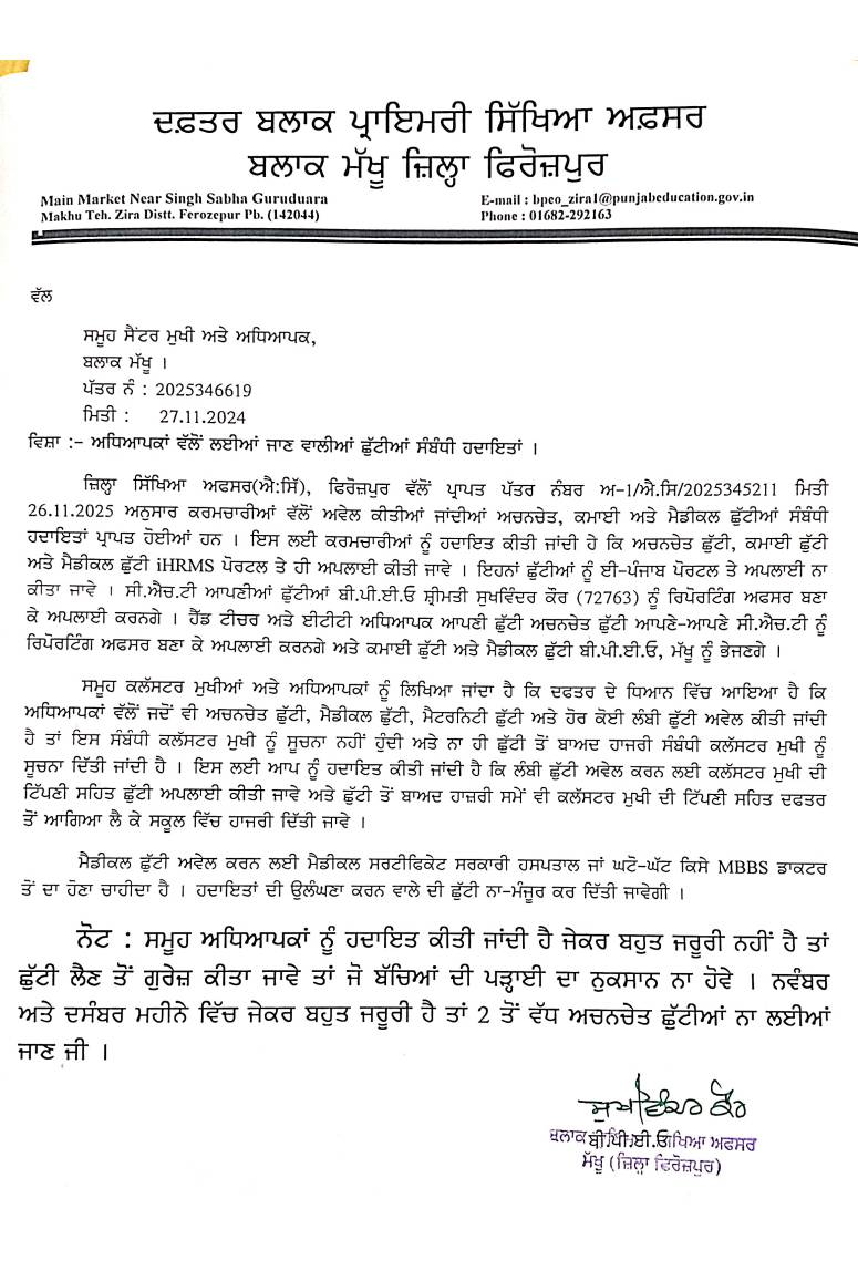 ਫਿਰੋਜ਼ਪੁਰ, 29 ਨਵੰਬਰ 2025 (Media PBN) ਸਮੂਹ ਸੈਂਟਰ ਮੁੱਖ ਅਧਿਆਪਕਾਂ ਨੂੰ ਇੱਕ ਜ਼ਰੂਰੀ ਪੱਤਰ (ਮਿਤੀ 27.11.2025) ਰਾਹੀਂ ਸਿੱਖਿਆ ਵਿਭਾਗ, ਪੰਜਾਬ ਵੱਲੋਂ ਵੱਡੀਆਂ ਹਦਾਇਤਾਂ ਜਾਰੀ ਕੀਤੀਆਂ ਗਈਆਂ ਹਨ।