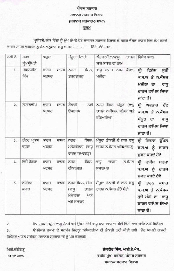 ਪੰਜਾਬ ਸਰਕਾਰ ਵੱਲੋਂ 5 ਅਫ਼ਸਰਾਂ ਦਾ ਤਬਾਦਲਾ, ਪੜ੍ਹੋ ਲਿਸਟ All Latest NewsNews FlashPunjab NewsTop BreakingTOP STORIES December 2, 2025 Media PBN Staff ਚੰਡੀਗੜ੍ਹ, 1 ਦਸੰਬਰ 2025 (Media PBN) – ਪੰਜਾਬ ਸਰਕਾਰ ਦੇ ਵੱਲੋਂ ਨਗਰ ਕੌਂਸਲ ਕਾਡਰ ਦੇ 5 ਅਫ਼ਸਰਾਂ ਦਾ ਤਬਾਦਲਾ ਕੀਤਾ ਗਿਆ ਹੈ। ਹੇਠਾਂ ਪੜ੍ਹੋ ਲਿਸਟ