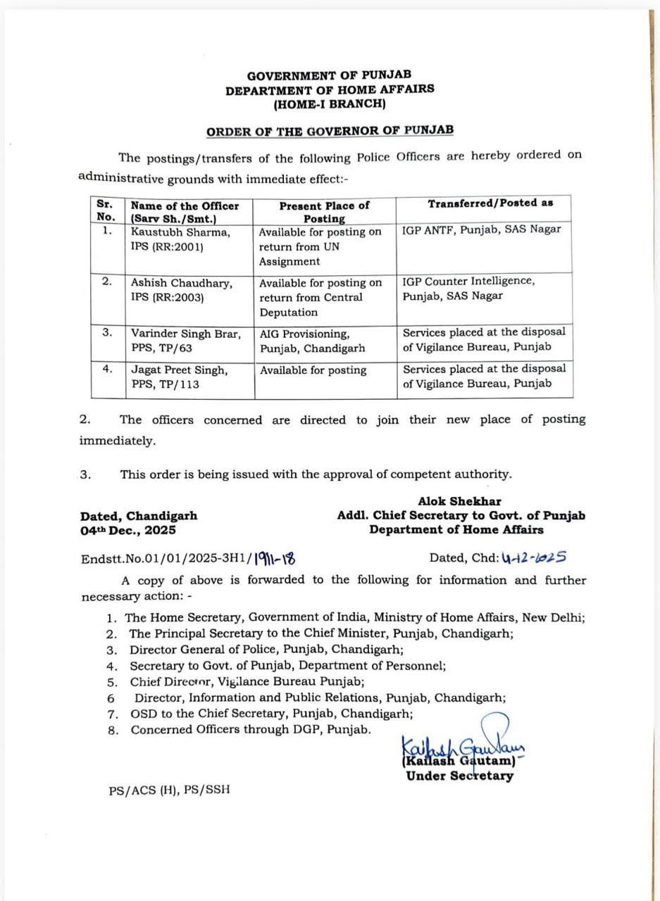 ਪੰਜਾਬ ਸਰਕਾਰ ਵੱਲੋਂ 4 IPS ਅਤੇ PPS ਅਫ਼ਸਰਾਂ ਦਾ ਤਬਾਦਲਾ, ਪੜ੍ਹੋ ਲਿਸਟ All Latest NewsNews FlashPunjab NewsTop BreakingTOP STORIES December 4, 2025 Media PBN Staff ਚੰਡੀਗੜ੍ਹ, 4 ਦਸੰਬਰ 2025 (Media PBN) ਪੰਜਾਬ ਸਰਕਾਰ ਦੇ ਵਲੋਂ ਚਾਰ ਆਈਪੀਐਸ ਅਤੇ ਪੀਪੀਐਸ ਅਫ਼ਸਰਾਂ ਦਾ ਤਬਾਦਲਾ ਕੀਤਾ ਗਿਆ ਹੈ। ਹੇਠਾਂ ਪੜ੍ਹੋ ਲਿਸਟ