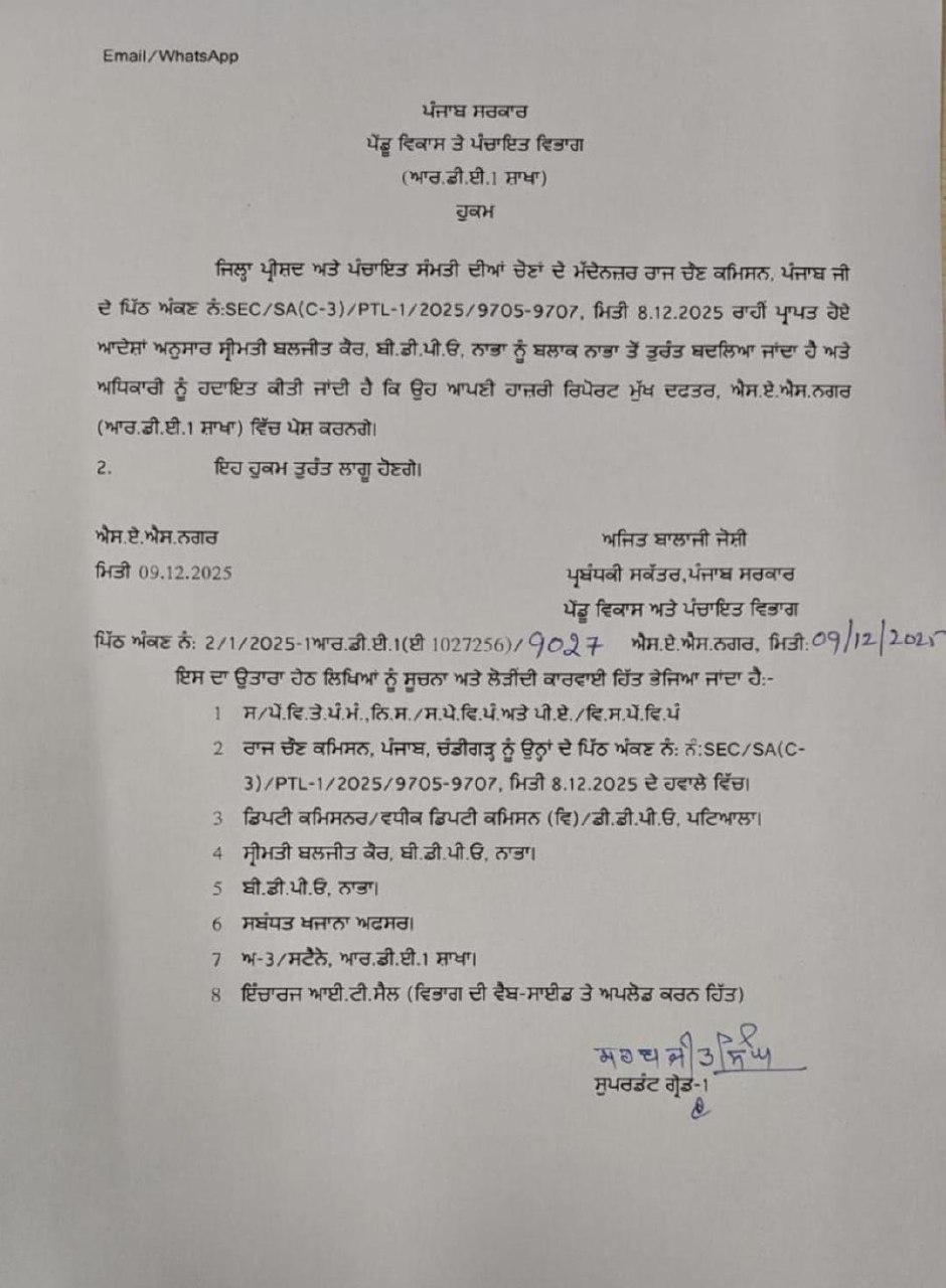 ਪੰਜਾਬ ਸਰਕਾਰ ਦੇ ਪੇਂਡੂ ਵਿਕਾਸ ਤੇ ਪੰਚਾਇਤ ਵਿਭਾਗ ਵੱਲੋਂ ਜਾਰੀ ਹੁਕਮਾਂ ਮੁਤਾਬਕ ਨਾਭਾ ਦੇ ਬੀ. ਡੀ. ਪੀ. ਓ. ਬਲਜੀਤ ਕੌਰ ਨੂੰ ਚੋਣ ਕਮਿਸ਼ਨ ਦੇ ਹੁਕਮਾਂ ਤਹਿਤ ਤੁਰੰਤ ਬਦਲ ਦਿੱਤਾ ਗਿਆ ਹੈ।