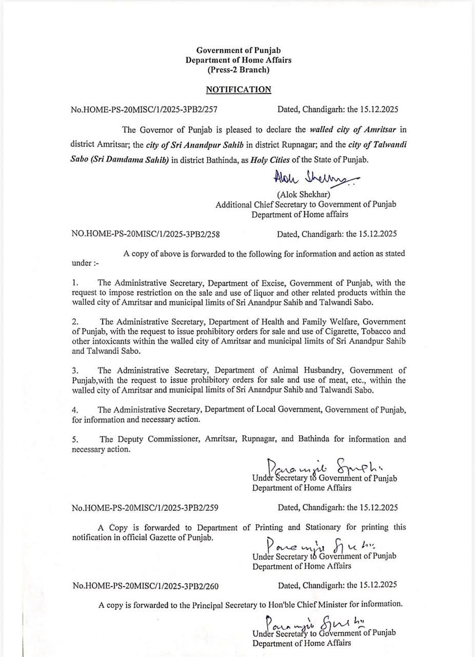 ਪੰਜਾਬ ਸਰਕਾਰ ਦੇ ਵੱਲੋਂ ਤਿੰਨ ਸ਼ਹਿਰਾਂ (ਅੰਮ੍ਰਿਤਸਰ, ਰੂਪਨਗਰ ਅਤੇ ਬਠਿੰਡਾ) ਵਿੱਚ ਸਥਿਤ ਮਹੱਤਵਪੂਰਨ ਸਥਾਨਾਂ ਬਾਰੇ ਵੱਡਾ ਫ਼ੈਸਲਾ ਲਿਆ ਹੈ। ਦਰਅਸਲ, ਸਰਕਾਰ ਨੇ ਤਿੰਨ ਜ਼ਿਲ੍ਹਿਆਂ ਵਿੱਚ ਸਥਿਤ ਮਹੱਤਵਪੂਰਨ ਸਥਾਨਾਂ ਨੂੰ ਪਵਿੱਤਰ ਸ਼ਹਿਰਾਂ (Holy Cities) ਵਜੋਂ ਘੋਸ਼ਿਤ ਕਰ ਦਿੱਤਾ ਹੈ ਅਤੇ ਇਸ ਬਾਰੇ ਨੋਟੀਫਿਕੇਸ਼ਨ ਵੀ ਗਵਰਨਰ ਪੰਜਾਬ ਵਲੋਂ ਜਾਰੀ ਕੀਤਾ ਗਿਆ ਹੈ।