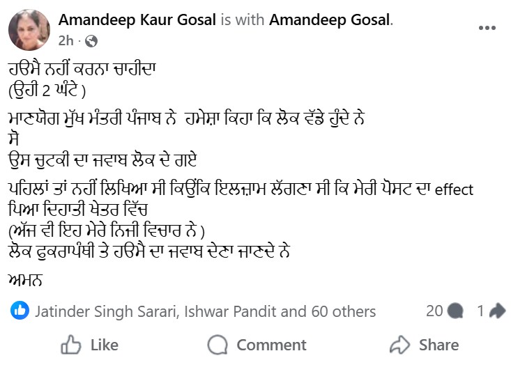 AAP MLA ਦੀ ਪਤਨੀ ਅਮਨਦੀਪ ਕੌਰ ਨੇ ਬਿਨ੍ਹਾਂ ਨਾਮ ਲਏ ਪੋਸਟ ਪਾਈ ਅਤੇ ਲਿਖਿਆ ਕਿ, ਹੳਮੈ ਨਹੀਂ ਕਰਨਾ ਚਾਹੀਦਾ (ਉਹੀ 2 ਘੰਟੇ)…. ਮਾਣਯੋਗ ਮੁੱਖ ਮੰਤਰੀ ਪੰਜਾਬ ਨੇ ਹਮੇਸ਼ਾ ਕਿਹਾ ਕਿ, ਲੋਕ ਵੱਡੇ ਹੁੰਦੇ ਨੇ… ਸੋ ਉਸ ਚੁਟਕੀ ਦਾ ਜਵਾਬ ਲੋਕ ਦੇ ਗਏ।